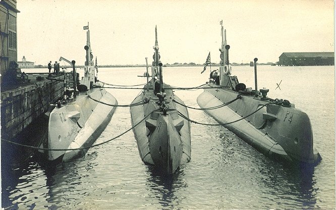 84k | F-4 (SS-23) at left at anchor in Honolulu, HI. with F-1 (SS-20), center, and F-2 (SS-21) outboard, moored together. Date unknown. | Courtesy of MMCM (SS) Greg Peterman USN Retired. Text i.d. from "The Romance of A Submarine" by G. Gibbard Jackson & submitted by Robert Hurst. | |||