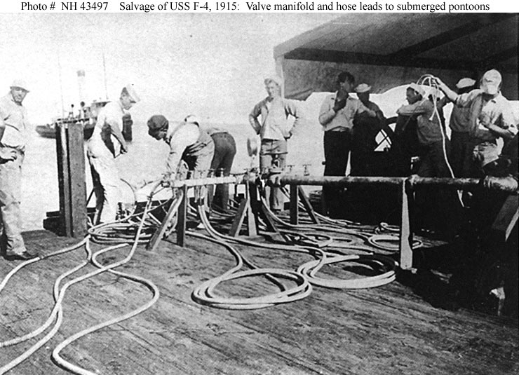104k | Salvage of F-4 (SS-23), April-August 1915. Valve manifold and hose leads to submerged pontoons, on board a salvage vessel off Honolulu, Hawaii, probably in August 1915. This equipment was devised by Naval Constructor Julius A. Furer. Halftone photograph, copied from "Transactions of the Society of Naval Architects and Marine Engineers", Volume 24, 1916, Figure 11. The tug in the left distance is probably Navajo. | USN photo # NH 43497, from the collections of the US Naval Historical Center. | |||
