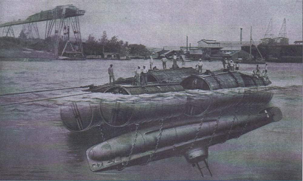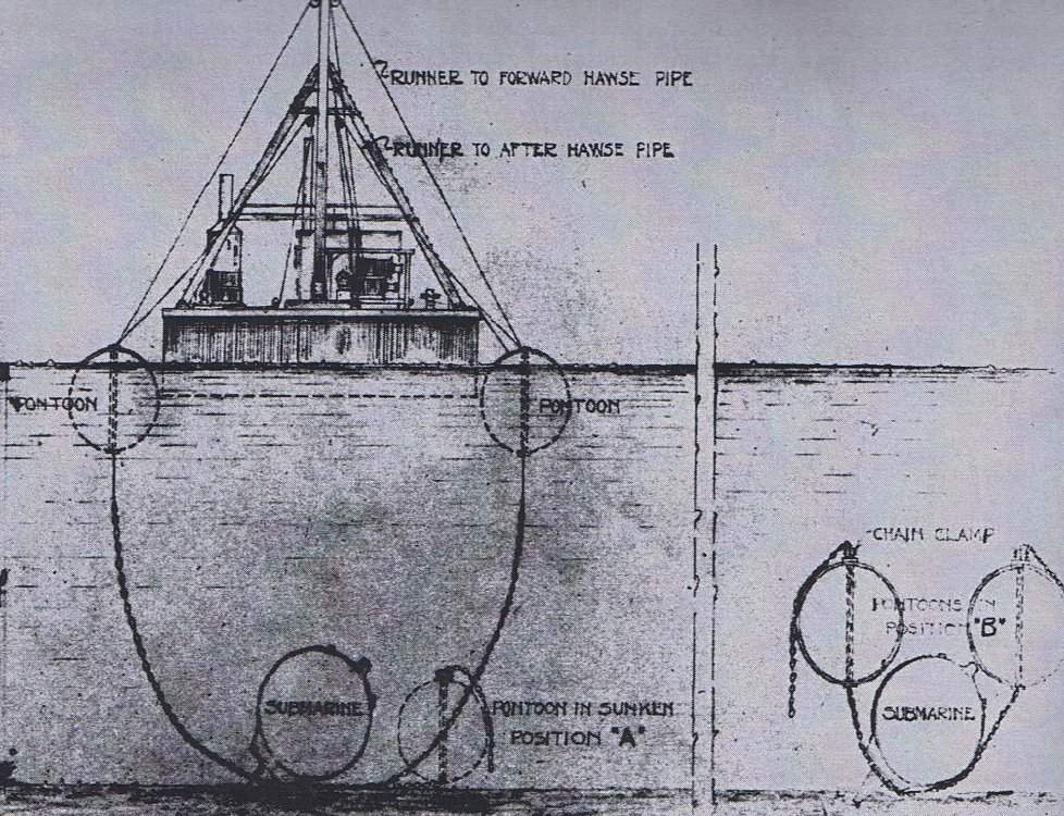 141k | Naval Constructor Furer developed this method for recovery of the F-4 (SS-23) from the ocean floor off Honolulu. Six large pontoons were constructed at Mare Island for this project and freighted to Hawaii on the deck of the armored cruiser Maryland (ACR-8). | Photo & text courtesy of Beneath the Surface: World War I Submarines Built in Seattle and Vancouver by Bill Lightfoot. | |||