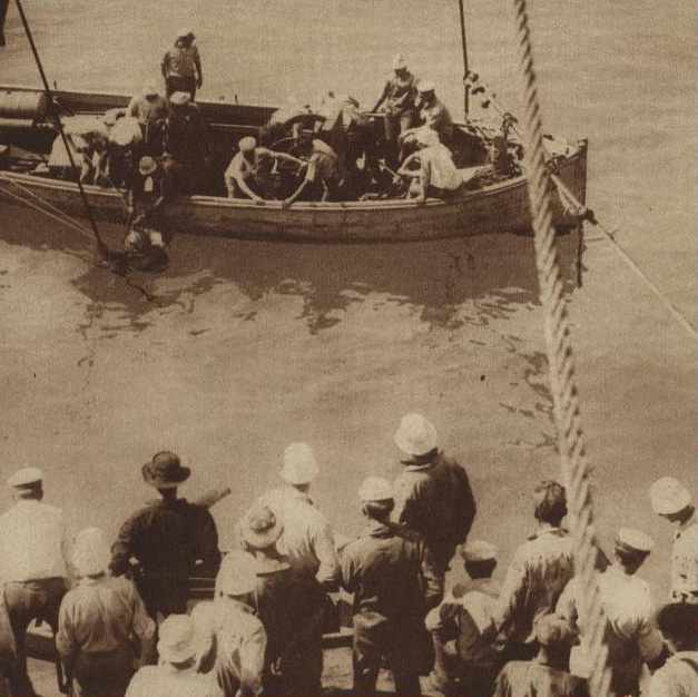 550k | Diver "Jack" Adrez going down to search for the F-4 (SS-23), when he had made the record dive of 215 feet. In the foreground on the government dredge brought to the scene for the purpose of raising the submarine, are the crews of the other United States submarines in the Honolulu Harbor. U.S.SUBMARINE F-4 LYING IN HONOLULU HARBOR. WITH CREW, ALL BUT ONE OF WHOM WERE LOST ON DECK. To the Left is the interned German Ship Gier, From a Photograph Taken a Short time Before the Last Manoeuvre Which Resulted in the Loss of the Undersea Fighter |