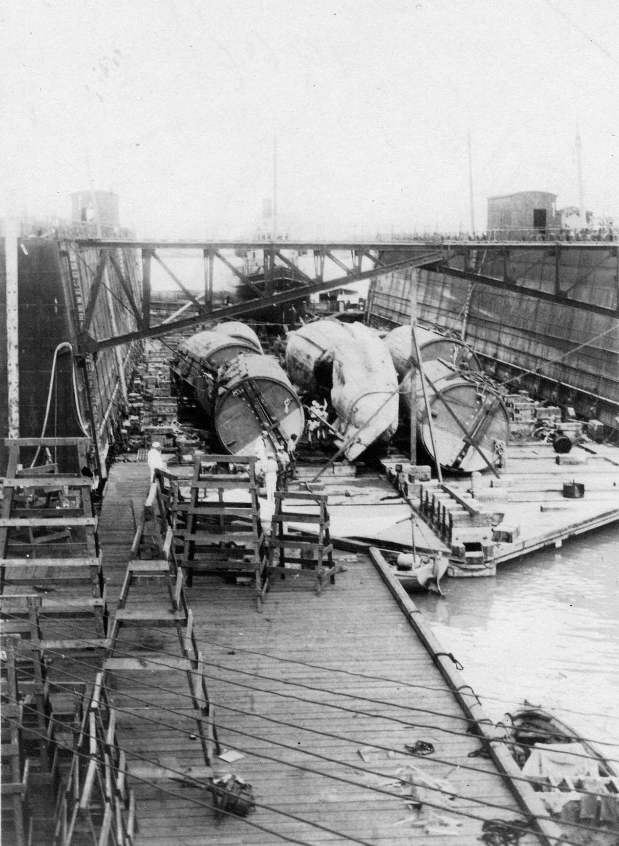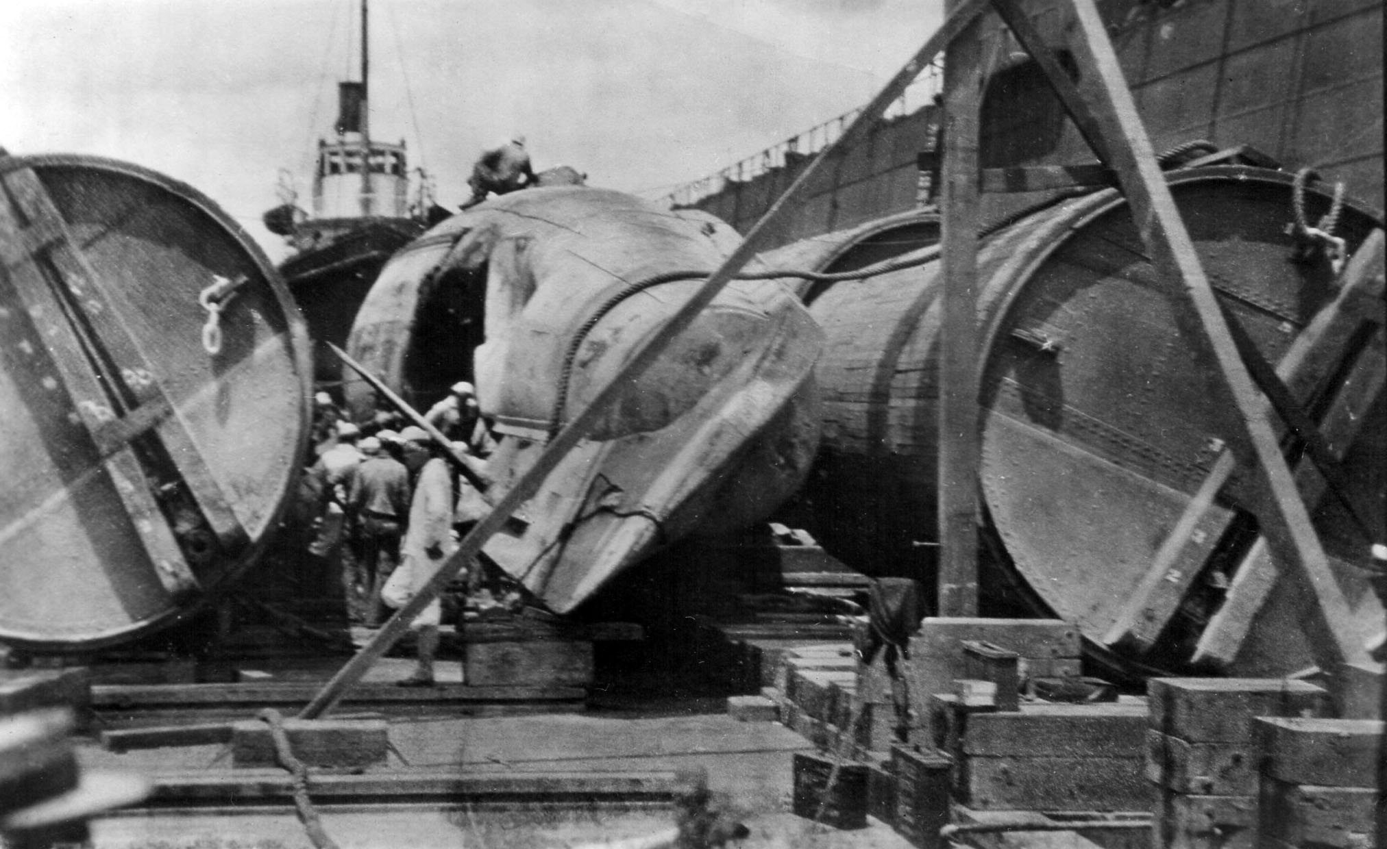 322k | F-4 (SS-23), 28 August 1915. Note the open bow cap. The bow cap was not removed, it is actually still in place, just rotated so that one of the openings for the tubes can be seen. It is curious to note that apparently the salvage crew was rotating the cap while the boat was in drydock. Some pics show it open, some shut. Most likely they wanted to remove torpedoes stored in the tubes for safety reasons. In this case it would have been a lot easier to pull the weapons out of the tubes from outside. With the boat upside down it would have been nearly impossible to pull them out into the torpedo room. |
