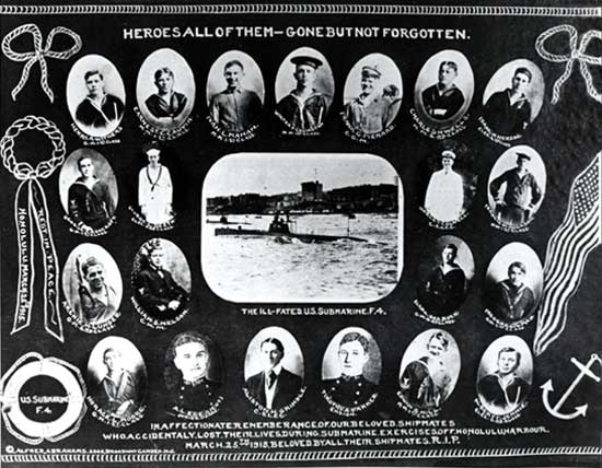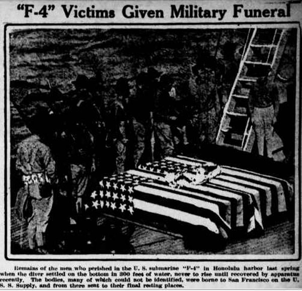 121k | F-4 (SS-23) Victims Given Military Funeral. Remains of the men who perished in the U. S. submarine F-4 in Honolulu harbor last spring when the diver settled on the bottom in 300 feet of water, never to rise until recovered by apparatus recently. The bodies, many of which could not be identified, were borne to San Francisco on the Supply, and from there sent to their final resting places. |