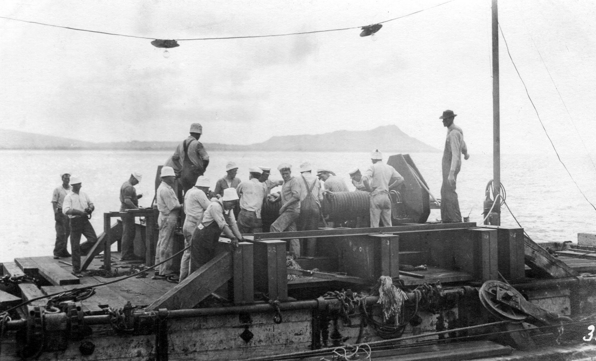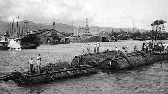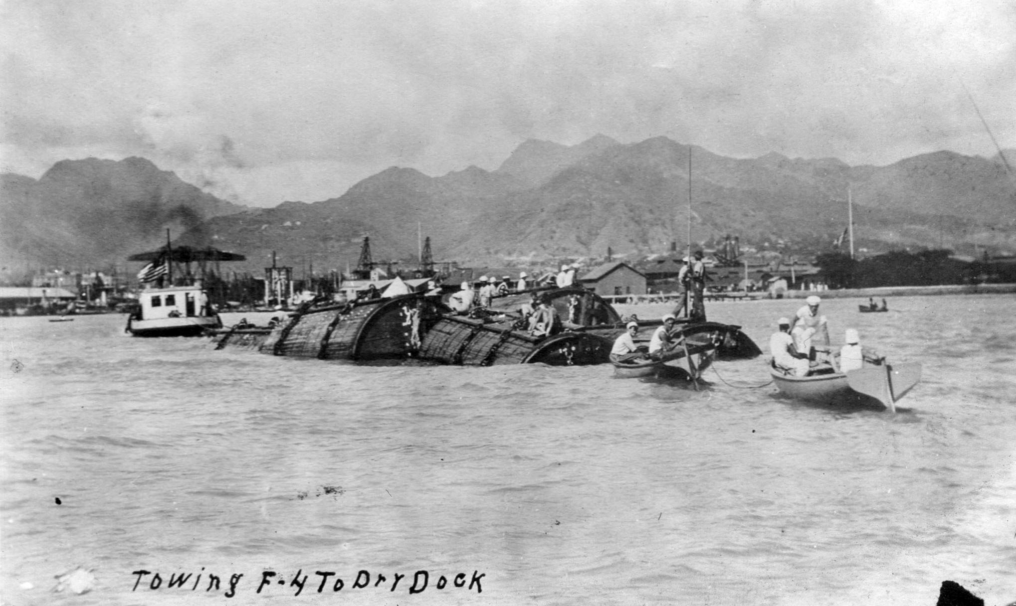 622k | Pontoons With Recovered Submarine F-4 (SS-23) Underneath Crossing Honolulu Harbor In Tow | Image and text provided by University of Hawaii at Manoa; Honolulu, HI. Photo & text by The Hawaiian Gazette. (Honolulu [Oahu, Hawaii]) 1865-1918, 31 August 1915, Image 1, courtesy of chroniclingamerica.loc.gov. |