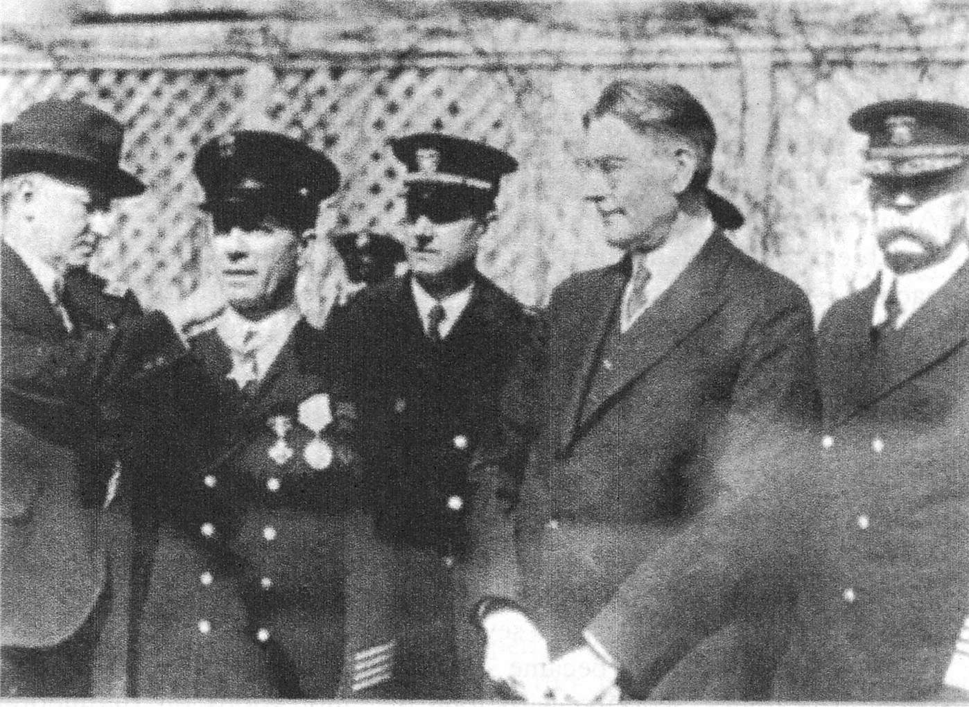 263k | President Calvin Coolidge presenting the Medal of Honor to Chief Petty Officer Frank Crilley on 15 February 1929 for his heroism in the rescue of Chief Petty Officer William F. Loughman during salvage operations on the submarine F-4 (SS-23). Left to right: President Coolidge, Chief Crilley, the now-ensign Loughman, Secretary of the Navy Curtis P. Wilbur, and Chief of Naval Operations Charles F. Hughes. | Image scanned from Mud, Muscles and Miracles, by Captain Charles A. Bartholomew, USN and Commander William I. Milwee, Jr., USN (Ret.) via Robert Hurst. | |||