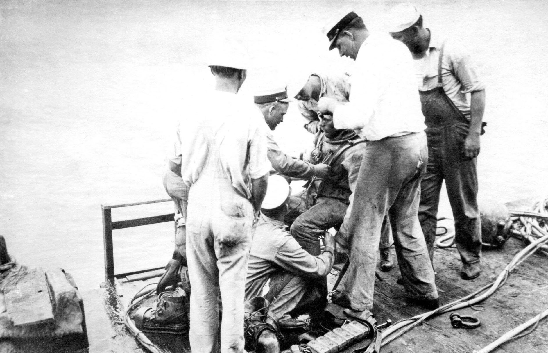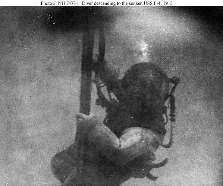 609k | DEEP SEA DIVER HUNTS LOST F-4 (SS-23) George Crilley (In diver's uniform), who was called upon to locate F-4 (lower picture), which sank with twenty-one in Honolulu bay. | Image and text provided by Library of Congress, Washington, DC. Photo & text by The Washington Herald. (Washington, D.C.) 1906-1939, 18 April 1915, PICTORIAL SECTION, Image 28, courtesy of chroniclingamerica.loc.gov. | |||