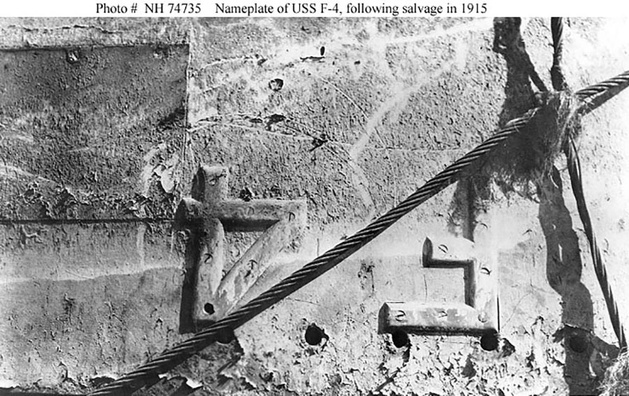 166k | View of F-4's (SS-23) port side name plate, taken in drydock at Honolulu, Hawaii, circa late August or early September 1915, after she had been raised from over 300 feet of water and towed into port. These figures are mounted on the submarine's port bow, and are shown upside down, as she was drydocked rolled to starboard approximately 120 degrees from the vertical. | Photo courtesy of Donald M. McPherson, 1972. USNHC photograph # NH 74731 via Robert Hurst. | |||