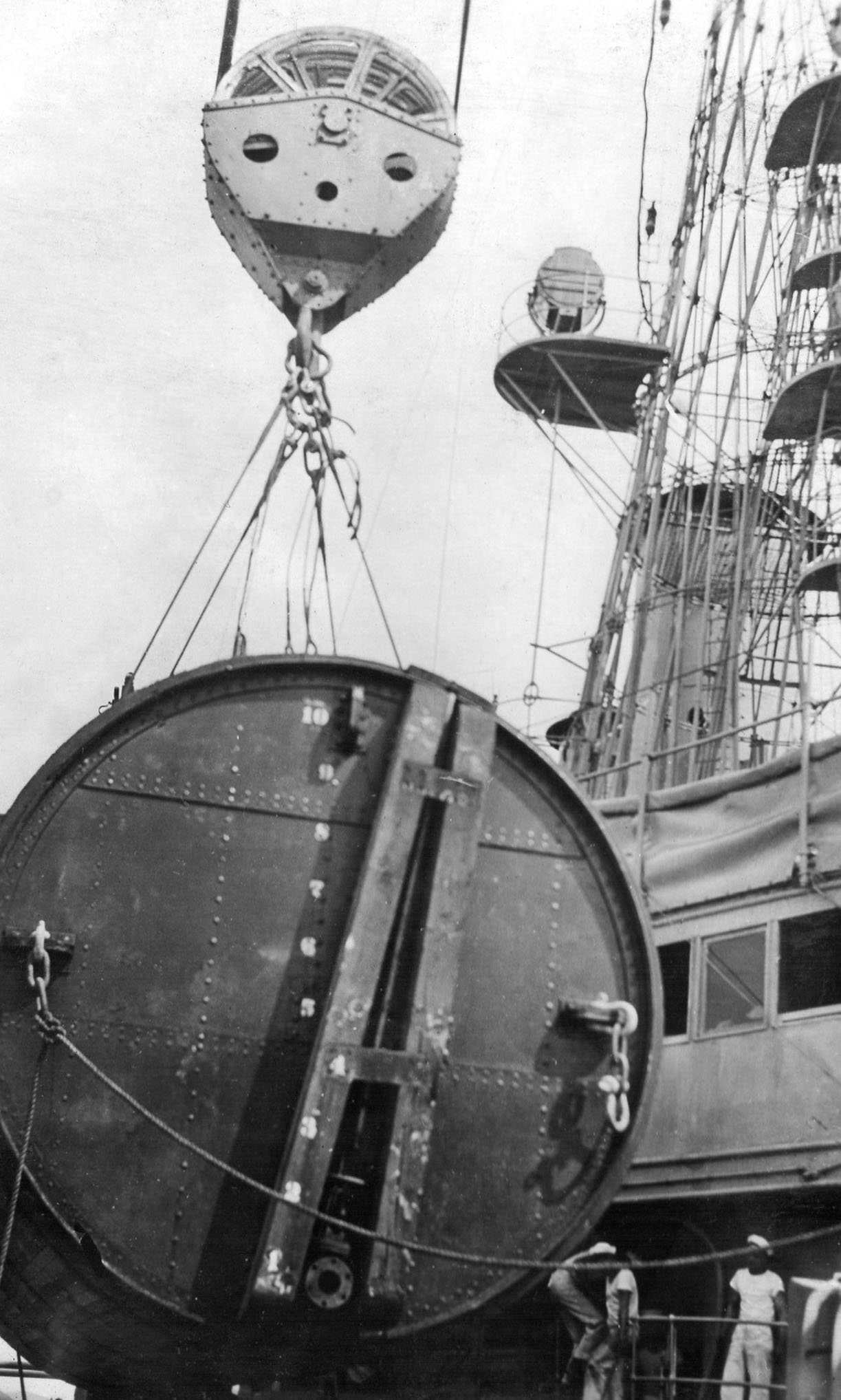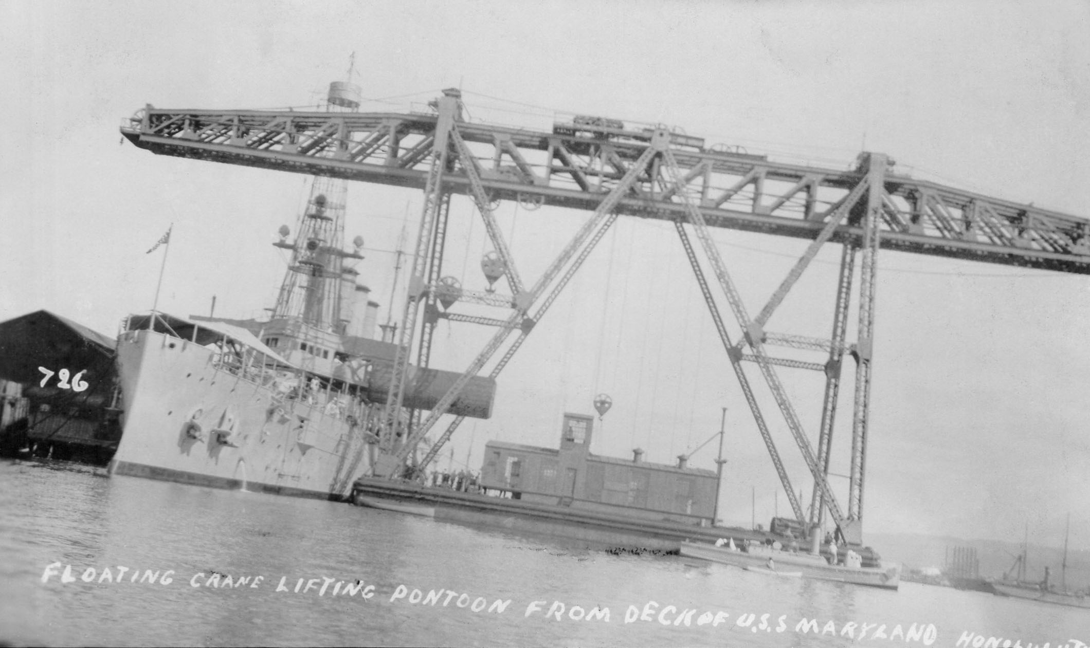 266k | Photo of one of the salvage pontoons being lifted aboard Maryland (ACR-8) at Mare Island Navy Yard. | Photo courtesy of Darryl L. Baker. | |||