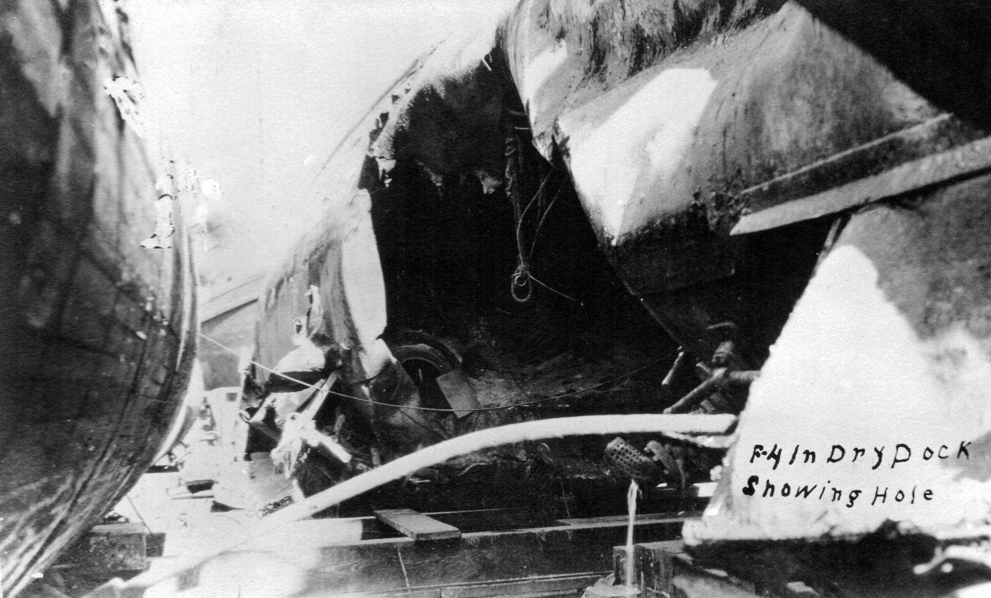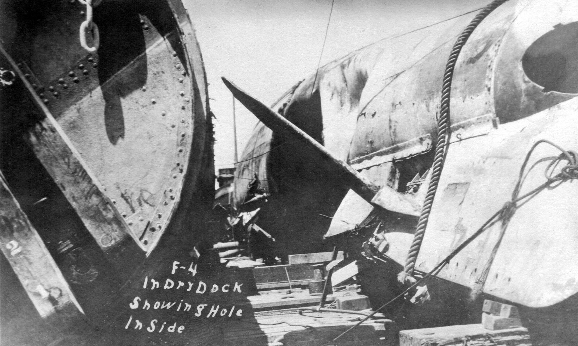 178k | Naval personnel examine the large implosion hole in F-4's (SS-23) port side, in drydock at Honolulu, circa late August or early September 1915. She had been raised from over 300 feet of water and towed into port. This view was taken from off the port bow, showing the submarine's port side diving plane in the center. She is upside down, rolled to starboard approximately 120 degrees from the vertical. | Text courtesy of photo # NH 74734, from the collections of the US Naval Historical Center. USN photo courtesy of Scott Koen & ussnewyork.com. |