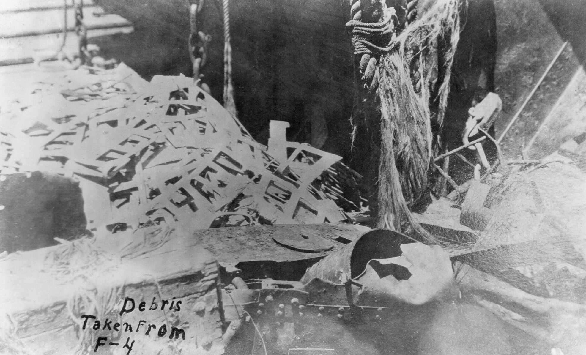 NR | The cause of the disaster to the F-4 (SS-23) in Hawaiian waters was the collapse of the inner shell of the oil tanks in the bow after the hull was crushed on a coral reef. | Image and text provided by Library of Congress, Washington, DC. Photo & text by New-York Tribune.(New York [N.Y.]) 1866-1924, 11 April 1915, Image 6, courtesy of chroniclingamerica.loc.gov. |