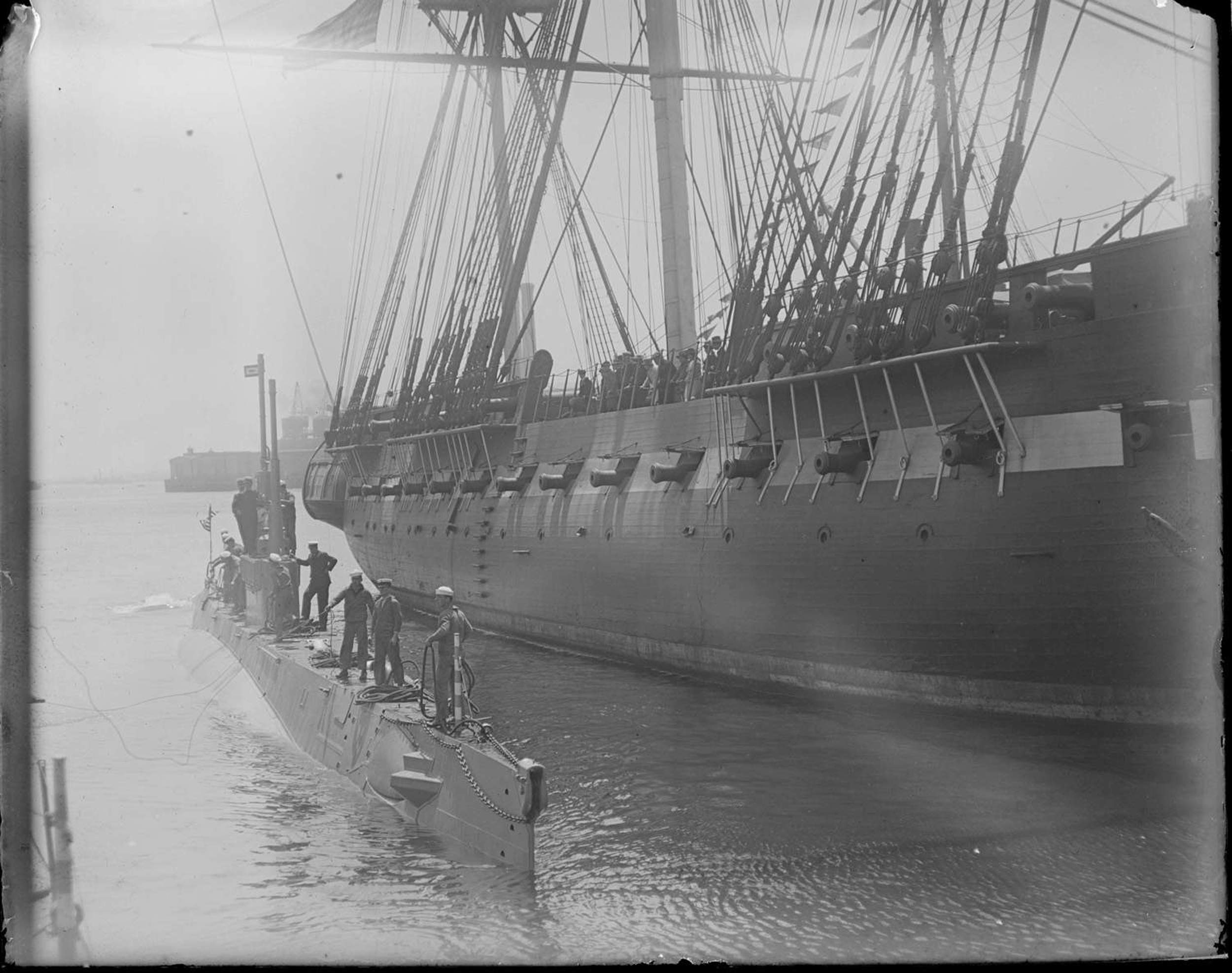 318k | Old and new at Navy Yard, latest class submarine, L-1 (SS-40), alongside Old Ironsides on Navy day. | Photo courtesy of the Boston Public Library, Leslie Jones Collection via Sean Hert & flickr.com. Photo i.d. courtesy of Ric Hedman. |