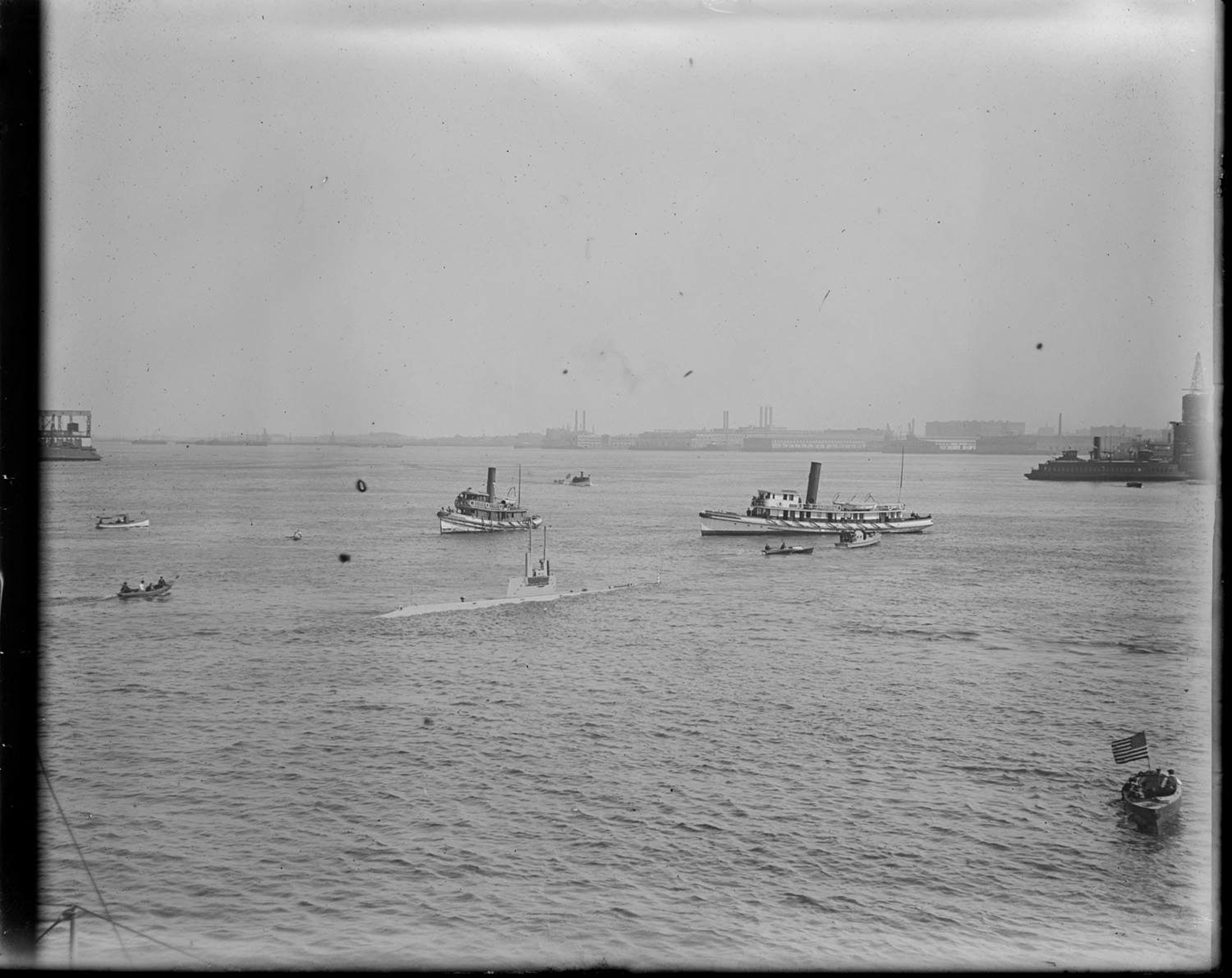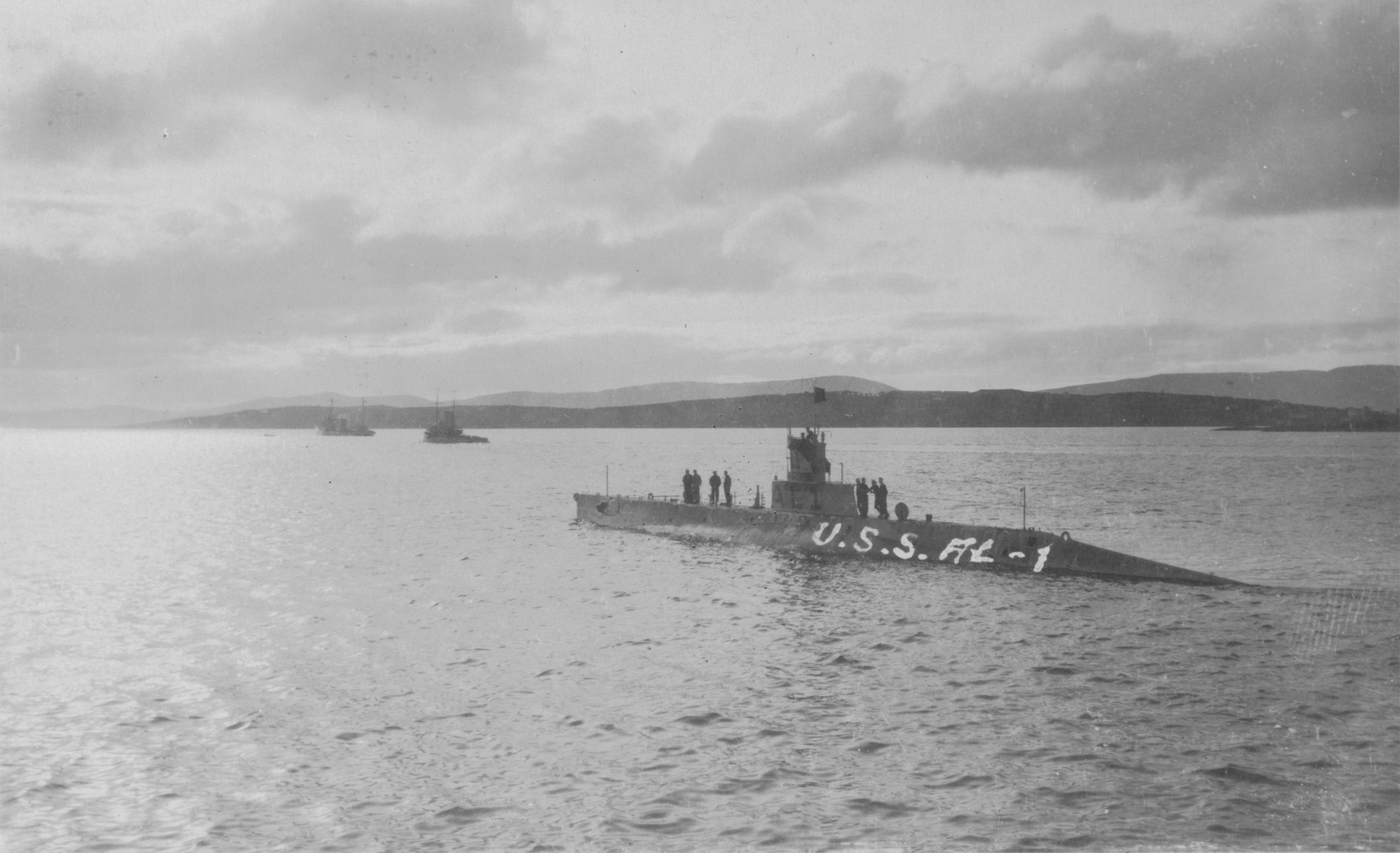600k | "L" class submarines probably alongside Bushnell (AS-2) at Bantry Bay, Ireland, in 1918. L-3 (SS-42), L-1 (SS-40), L-10 (SS-50), L-4 (SS-43), L-9 (SS-49). | USN photo # Lot-5410-23,Secretary of the Navy Josephus Daniels Collection. Photographed through Mylar sleeve. Courtesy of the Library of Congress via National Museum of the U.S. Navy via flickr.com. | |