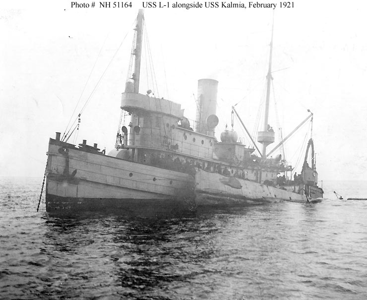 ![]() | 70k | L-1 (SS-40) tied up alongside Kalmia (AT-23) off Lewes, Delaware, on 5 February 1921. L-1's after ballast tanks have been partially filled, raising her bow. | USNHC photograph, # NH 51164, data courtesy of Gary Priolo. | |