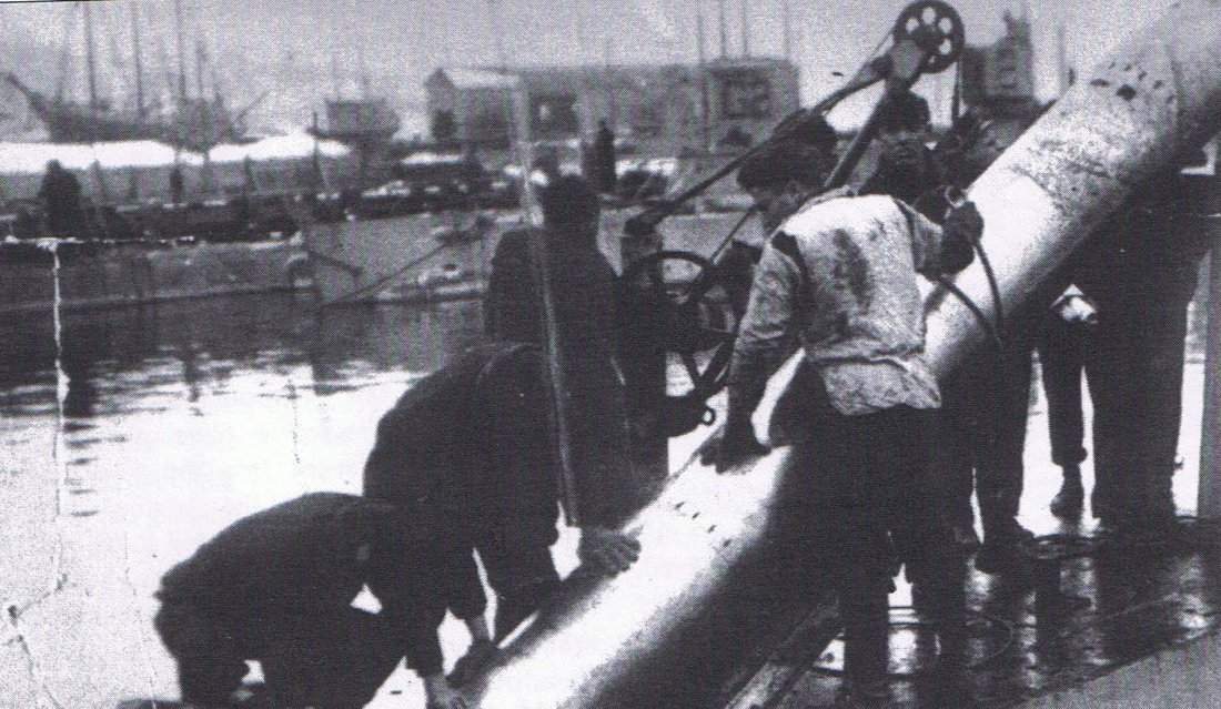 ![]() | 99k | The crew of N-1 (SS-53) "horsing" a 2,000-pound torpedo through the loading hatch, 1918, probably at New London CT. The stowable davit with head sheave and hand winch is a necessary part of this exercise unless a shore side crane can be used. Note: There are other submarines that can be seen moored in the background. The submarine G-2 (SS-27) is the only boat readily identifiable. | Photo & text courtesy of Beneath the Surface: World War I Submarines Built in Seattle and Vancouver by Bill Lightfoot. Photo courtesy of John Parker. | |
