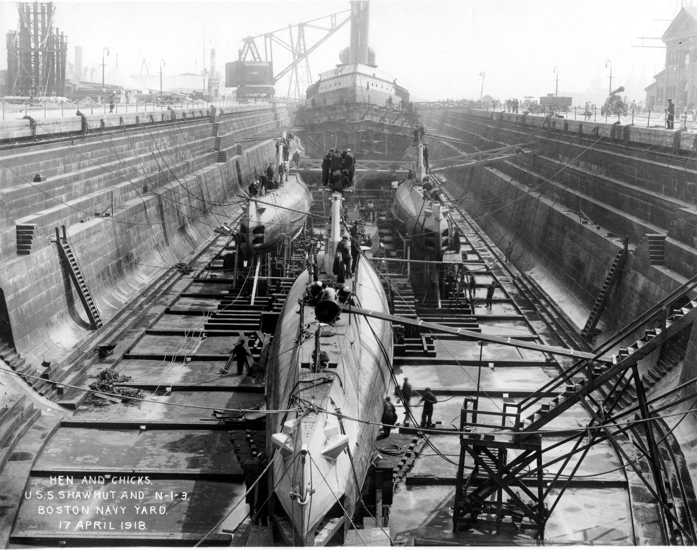 244k | Photo entitled "Hen and Chicks" shows the Minelayer Shawmut (Id.No. 1255 / CM-4) is seen in Dry Dock 2 of the Boston Navy Yard on 17 April 1918, outward of submarines N-1 (SS-53), N-2 (SS-54), and N-3 (SS-55). | Boston Navy Yard photo # 3734, from the National Park Service, Boston National Historical Park, cat.no. BOSTS-13838, courtesy of Stephen P. Carlson, Preservation Specialist, Boston NHP, Charlestown Navy Yard. | |