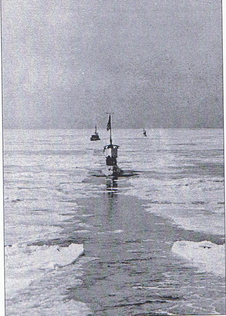 686k | Following sea trials in Puget Sound, N-3 (SS-55), with sister ships N-1 (SS-53), and N-2 (SS-54), departed the Navy Yard 21 November 1917. The three submarines arrived at New London 7 February 1918. Fighting ice. The tender Savannah (AS-8) plows alead through the ice of Long Island Sound for the three N-boats as they near the end of their 7,000 mile journey from the more temperate waters of Puget Sound. A canvas dodger remains as the protection for the bridge watch. |