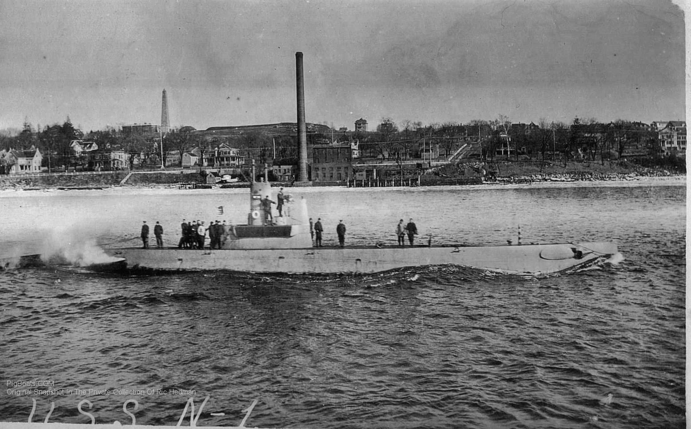 1.46k | N-1 (SS-53) traveling down the Thames River circa spring of 1918. She is yet to get her steel chariot bridge surround installed. The man forward of the periscope sheers, standing on the bridge access hatch, is the helmsman. Behind, on the shore, can be seen the Fort Griswold Monument and Fort Griswold itself, to the left of the large smoke stack. Fort Griswold is a revolutionary war fort that was the scene of a bloody massacre by the British on American forces. Survivors were taken from the fort and placed on prison ships moored in the Thames River. |