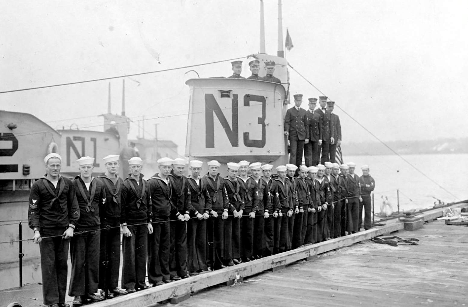 599k | N-3 (SS-55), showing ship's crew at the New London submarine base Connecticut circa 1919. N-1 (SS-53), and N-2 (SS-54) are in the background. | Source: US Naval History Heritage and Command, Photo No. NH 45627 via Mike Green. | |