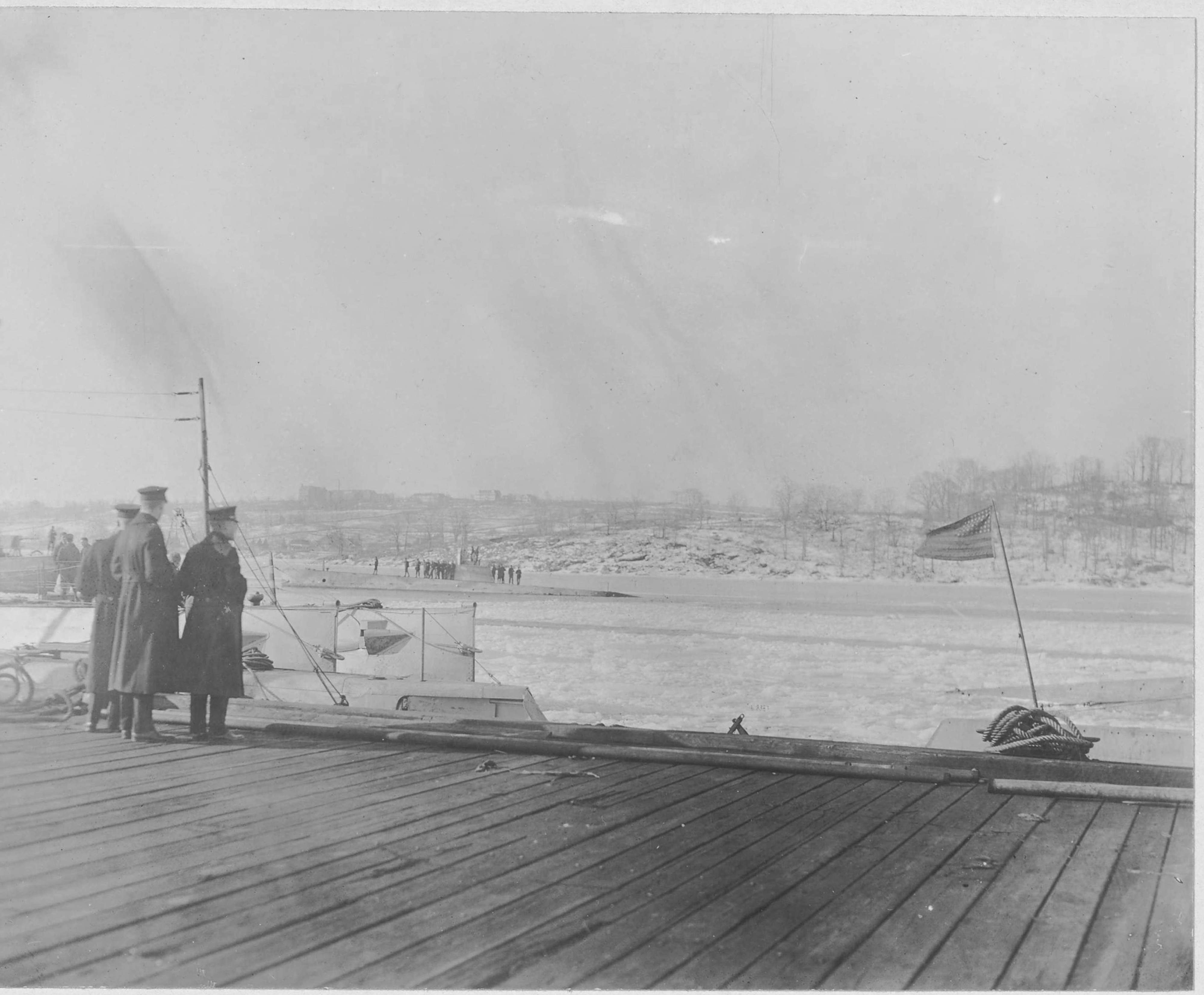 549k | U.S. submarine going to sea for practice, circa 1918: From right to left, two subs in the photo to the right, You can just see the sterns and a flag. Class/s unknown. D-boat in mid-river. She is ballasted down aft so that her props, rudder, and aft diving planes clear the ice in the river. Next to pier is the G-3 (SS-31), the other two boats alongside the pier are actually EB design N-class boats, ( N-1, 2 & 3). The arrangement of the towing fairlead bullnose, the towing shackle, and the bow plane arrangement all match EB design N-boats. You can see Conn College on the hill in the background. |
