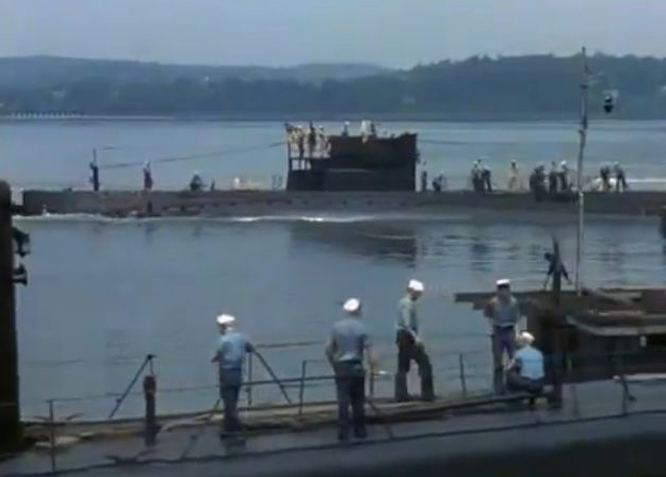 189k | A scene from the 1943 movie Crash Dive, showing an unidentified O-class submarine backing out of a berth at the Naval Submarine Base New London, CT in the late summer of 1942. The boat can not be positively identified, but is one of group of eight O-class submarines that were brought out of mothballs to train submarine crews. This particular boat is either O-2 (SS-63),O-3 (SS-64), O-4 (SS-65), O-7 (SS-68), O-8 (SS-69), or O-10 (SS-71). The submarine in the foreground is the Marlin (SS-205). | Photo & text courtesy of David Johnston | |