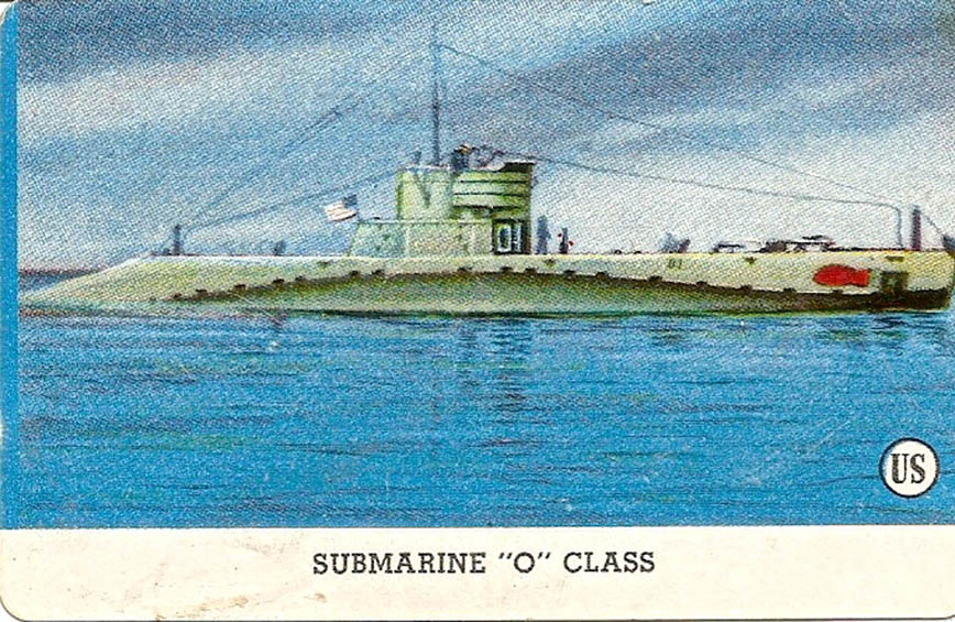 174k | The O-4 (SS-65), one of the small undersea craft of the O-Boats series built during WW I, displaced only 480 tons on the surface, less than half of modern subs. Recommissioned in 1930, however, they have proved valuable as training an experimental vessels. Equipped with four torpedo tubes and one anti aircraft machine gun, they can give valuable experience to the new submariners of the U.S. Navy. | Text courtesy of CARD-O chewing gum. Photo courtesy of Tommy Trampp. | |