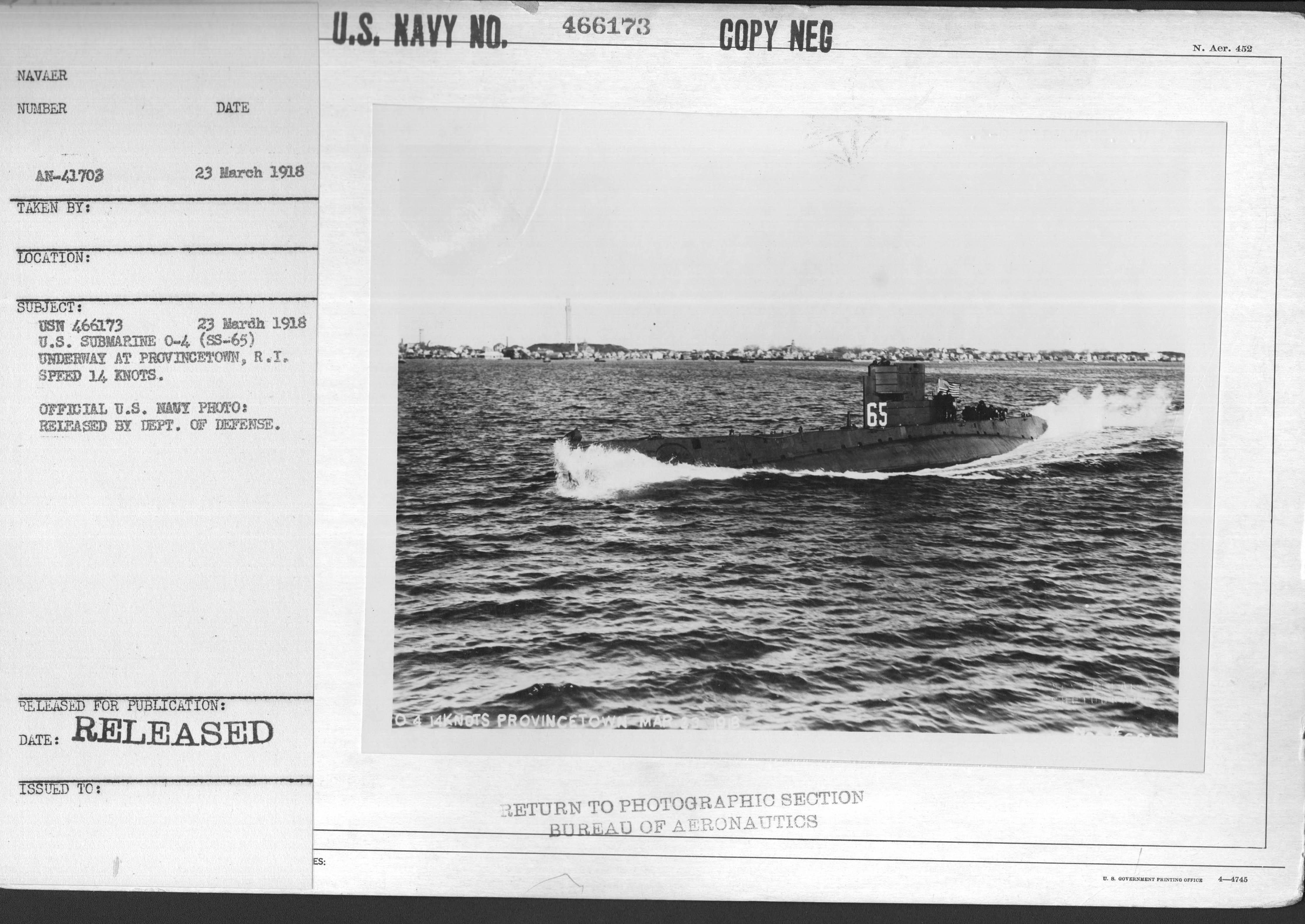 961k | 23 March 1918, the O-4 (SS-65) doing 14 knots off Provincetown. | USN photo # 80-G-466173 from NARA, College Park, Maryland, courtesy of Sean Hert. | |