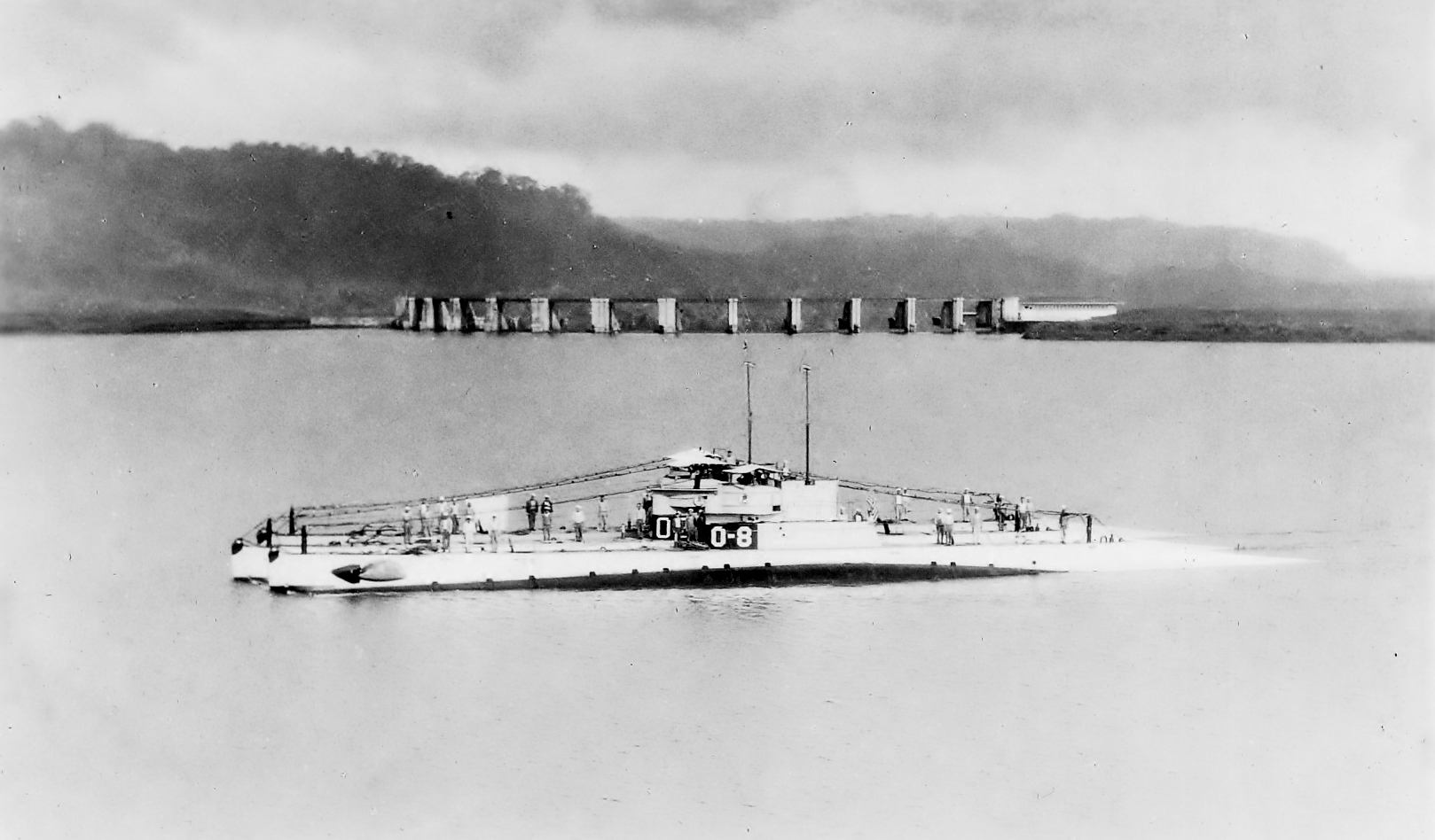 ![]() 0806917 | 484k | 3 O-boats bows: Broadside view of O-8 (SS-69) with two other unidentified O-boats moored to a buoy in Gatun Lake, Panama, approximately 1925. The famous Gatun Dam can be seen in the background, with the hydroelectric power station building on the right. The dam is the centerpiece of the canal, providing water for the 21 mile long lake as well as for the majority of the rest of the canal. It also provides power to operate the locks as well as for the needs of the surrounding population. | Photo i.d. & text courtesy of David Johnston (USN, retired) USN photo thanks to Jim Kurrasch @ Battleship Iowa, Pacific Battleship Center. | |