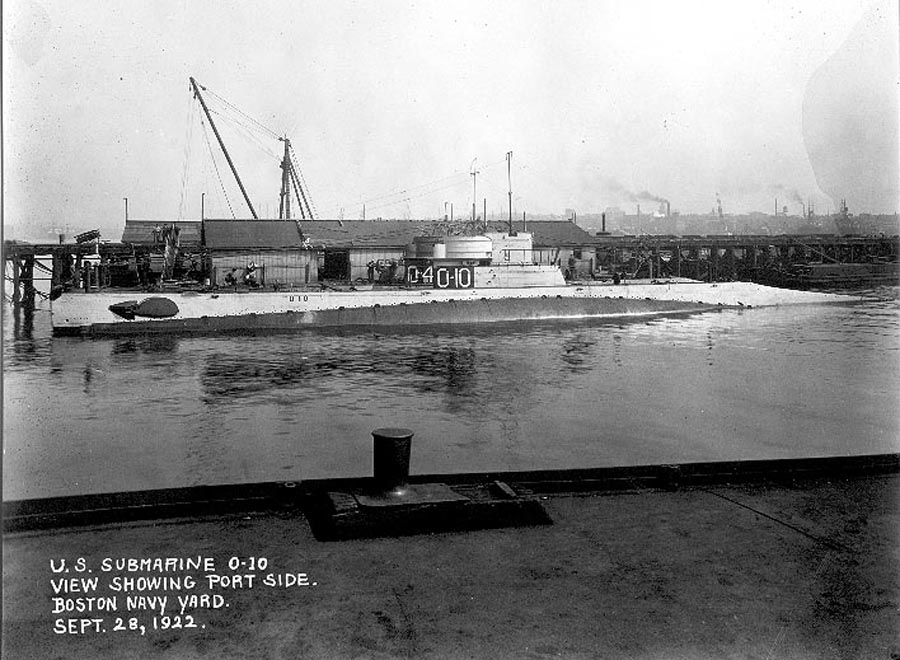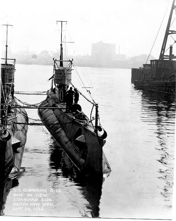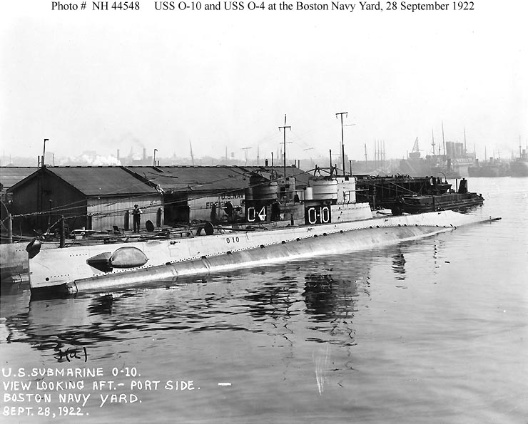 130k | Port side view of the O-10 (SS-71) taken at the Boston Navy Yard on 28 September 1922. The submarine is tied up outboard of O-4 (SS-65) and a covered lighter at Pier 10. | Boston Navy Yard photo # 13813-3 Boston, National Historical Park Collection, NPS Cat. No. BOSTS-13813. Photo courtesy of Stephen P. Carlson, Preservation Specialist, Boston NHP, Charlestown Navy Yard. | |