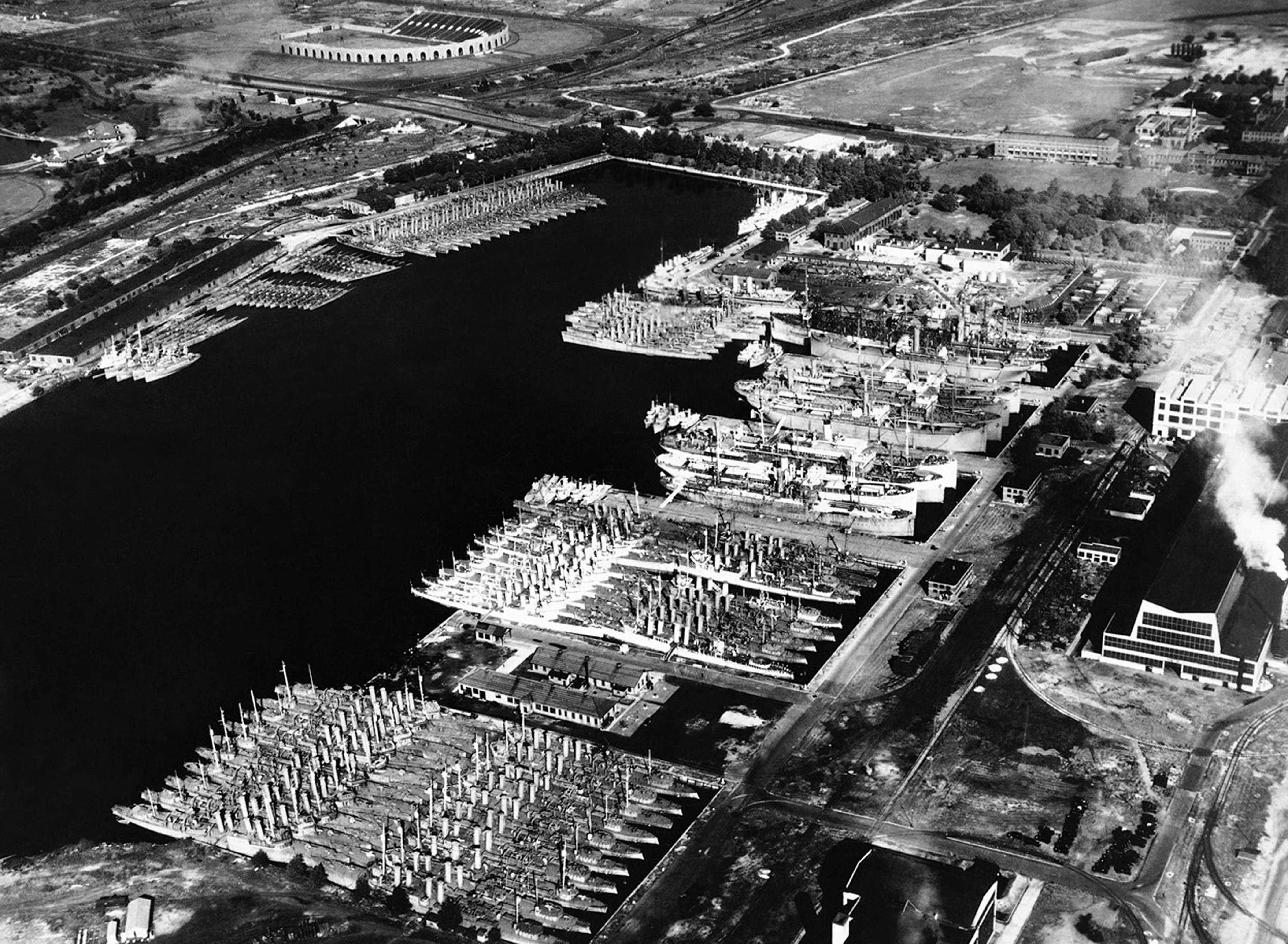 2.49k | Philadelphia Navy Yard, 28 October 1940. The photo presented panorama military shipyards in Philadelphia Navy Yard. Most of the ships are obsolete US destroyers, that were transfer to Great Britain under lend lease. The submarines are on the left hand side of the photo, and they are: (in no particular order) The O boats: O-1 (SS-62), O-2 (SS-63), O-3 (SS-64), O-6 (SS-67), O-7 (SS-68), O-8 (SS-69), O-9 (SS-70), O-10 (SS-71). The R boats: R-1 (SS-78), R-2 (SS-79), R-3 (SS-80), R-5 (SS-82), R-6 (SS-83), R-7 (SS-84), R-8 (SS-85), R-9 (SS-86), R-10 (SS-87), R-12 (SS-89), R-15 (SS-92), R-16 (SS-93), R-17 (SS-94), R-18 (SS-95), R-19 (SS-96) & R-20 (SS-97). The S boats: S-11 (SS-116), S-12 (SS-117), S-13 (SS-118), S-14 (SS-119), S-15 (SS-120), S-16 (SS-121), S-17 (SS-122) & S-48 (SS-159). The Olympia (C-6) is shown at the right of the wharf on Broad Street. The stadium in the upper left, was John F. Kennedy Stadium (formally Philadelphia Municipal Stadium) that stood from 1926 to 1992. It was erected for the 1926 Sesquicentennial. |