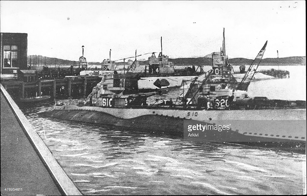 561k | S-10 (SS-115) & S-15 (SS-120) in the foreground. Behind them from right to left: O-1 (SS-62), O-4 (SS-65), O-2 (SS-63) & O-3 (SS-64). What appears to be another conning tower is behind the O-3. If so, and being that all the O-boats are together numerically, it might be the O-5 (SS-66), which would date the photo no later than 28 October 1923 when the O-5 sank after being rammed while entering Limon Bay, Canal Zone, 28 October 1923, by United Fruit steamer Abangarez. |