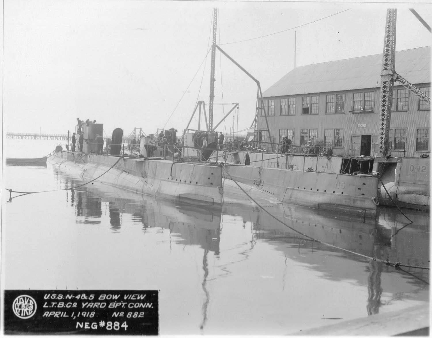 110k | N-4 (SS-56), N-5 (SS-57), & O-12 (SS-73) tied up to dock at Lake Torpedo Boat Co., Bridgeport, CT., 1 April 1918. | USN photo # 19-N-884, from the National Archives and Records Administration (NARA), courtesy of Daniel Dunham. | |