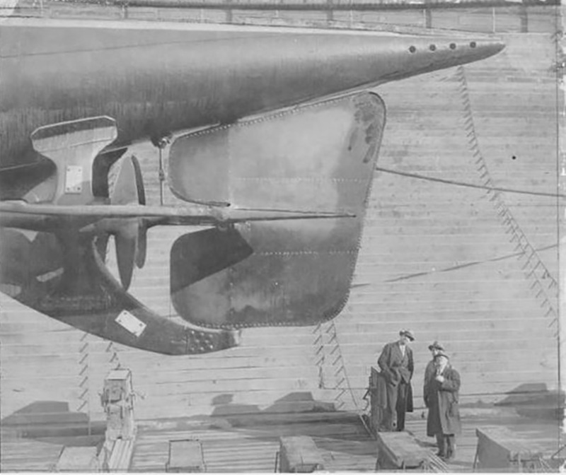 224k | Nautilus crew stand below rudder and propeller, 15 December 1930. "The Australian Arctic and Antarctic explorer is shown at right in photograph at the left, on the deck of the Nautilus, the former O-12 (SS-73) submarine, which he obtained from the Navy on charter and which is being remodeled in drydock for a proposed trip to Arctic waters next summer. Shown with the explorer are former Lieutenant Commander Isaac Schlossbach (left), of Bradley Beach N.J., in charge of the Nautilus in the absence of former Lieutenant Commander Sloan Danenhower, both of whom will go North in the craft, and Simon Lake (centre), veteran submarine inventor and builder, who is directing the remodeling. They are also shown inspecting the cigar-shaped afterpart of the Nautilus, suspended from which are the rudder and its supporting structure, with the propeller in the centre." |