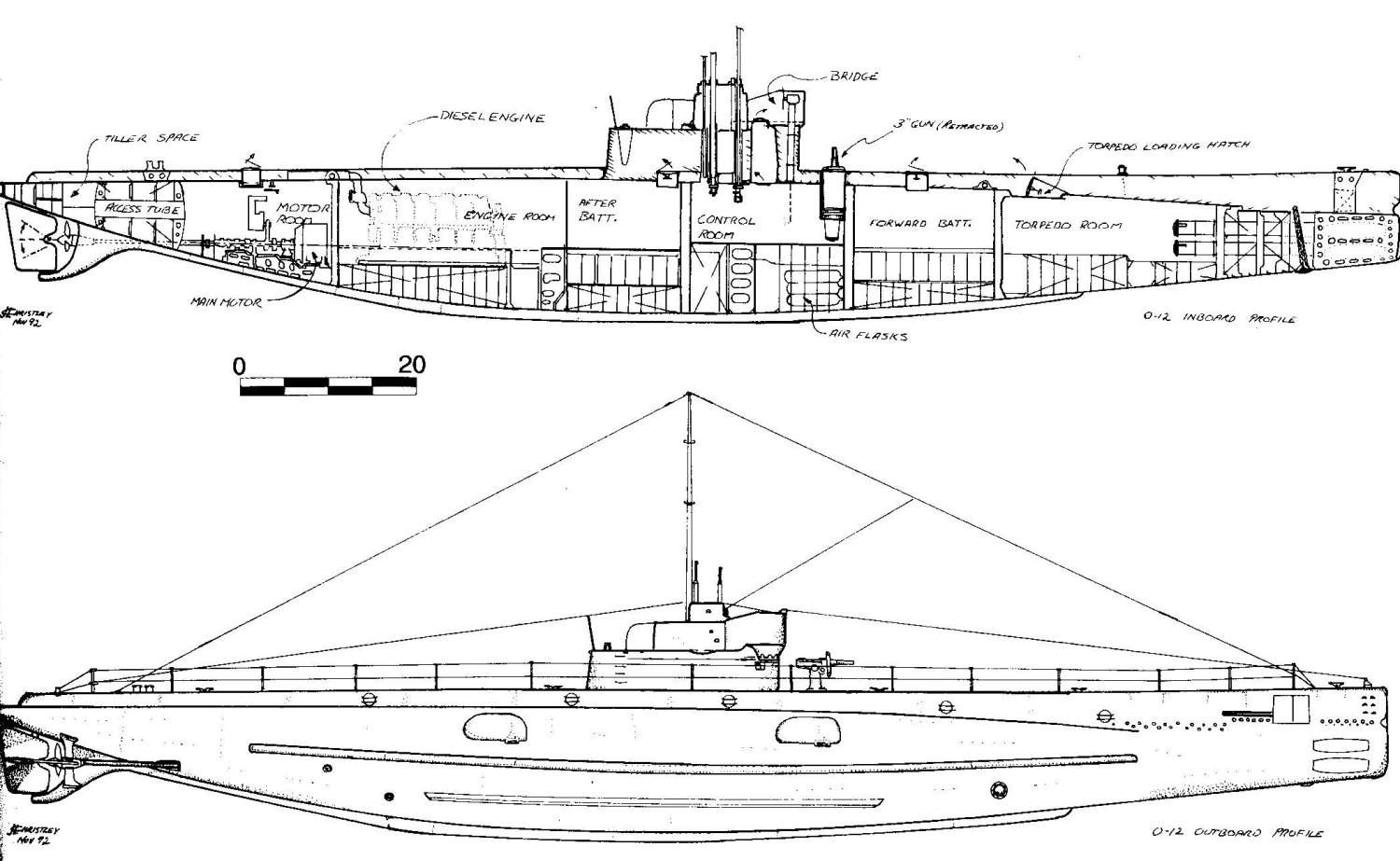 135k | Simon Lake's O-12 (SS-73) retained his trademark stern and amidships planes (shown folded down in the outboard view). Note the seperate flooding ports in the watertight superstructure. | Drawing by Jim Christley, text courtesy of U.S. Submarines Through 1945, An Illustrated Design History by Norman Friedman. Naval Institute Press. |