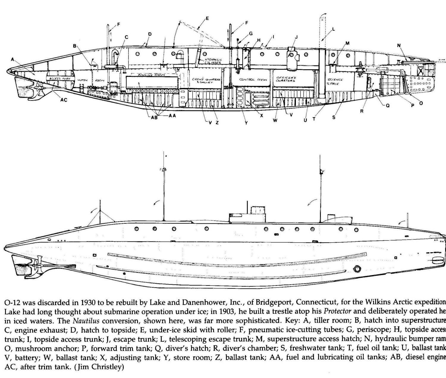 224k | O-12 (SS-73) was discarded in 1930 to be rebuilt by Lake & Danenhower Inc., of Bridgeport CT., for the Wilkins Artic expedition. Lake had long thought about submarine operations under ice; in 1903, he built a trestle atop his Protector and deliberately operated her in iced waters. The Nautilus conversion, shown here, was far more sophisticated. | Drawing by Jim Christley, text courtesy of U.S. Submarines Through 1945, An Illustrated Design History by Norman Friedman. Naval Institute Press. | |