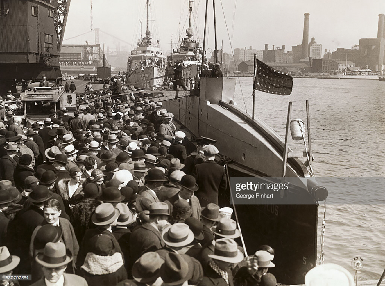 742k | (Original Caption) A bucketful of cracked ice was used for the christening at the Brooklyn Navy Yard for the submarine Nautilus, which had been fitted out for a trip this summer to the North Pole. Jean Jules Verne, grandson of the author of Twenty Thousand Leagues Under The Sea. aided Lady Wilkins, wife of Sir Hubert Wilkins, leader of the proposed Arctic expedition, in the ceremonies. Speeches were made by Sir Hubert, Verne and Captain Sloan Danenhower, commander of the vessel. Here is a general view showing the throngs getting a glimpse of the Nautilus being christened in the Navy Yard. | Photo by George Rinhart/Corbis via Getty Images, courtesy of gettyimages.com. | |