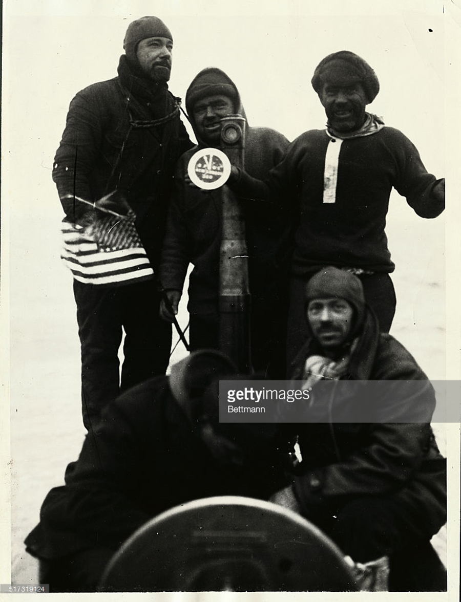402k | (Original Caption) Sir Hubert Wilkins is shown with radio expert R. Meyers, and Frank Crilley, deep sea diver, about to toss overboard the 'Stars and Stripes' and the American Society of Elks emblem in the Arctic waters at the northernmost point of their dash toward the North Pole, in the submarine Nautilus. The other two crew members were not identified. | Photo by Bettmann/Getty Image, courtesy of gettyimages.com. | |