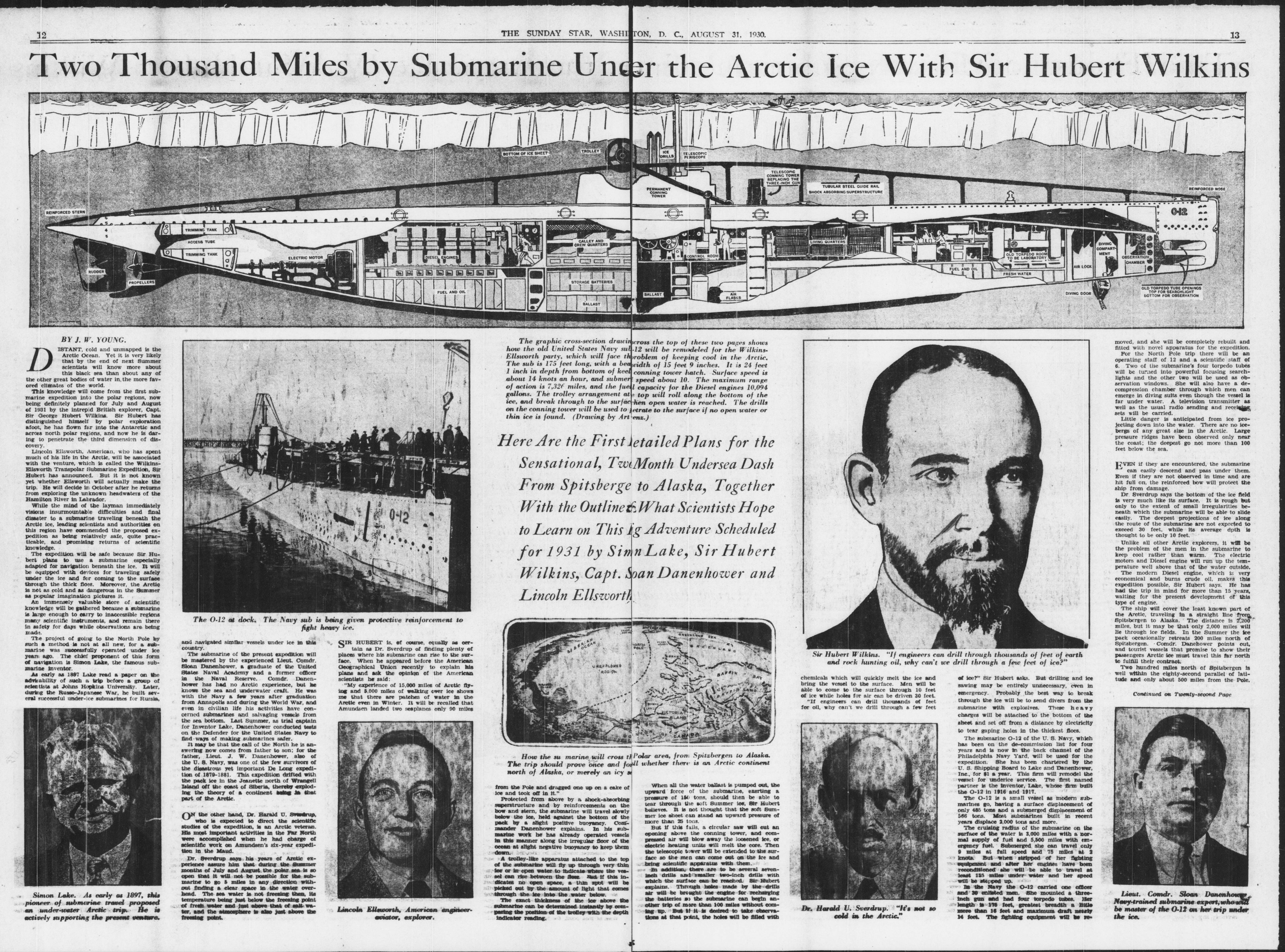 NR | Noted English Explorer Plans to Sail Under Polar Ice in Battered U-Boat Captain Sir Hubert Wilkins, of Arctic and Antarctic Fame Seeks Charter on the Old United States Submarine, the O-12 (SS-73), in Which He Plans to Sail to Behring Straits Under Ice. | Image and text provided by Alaska State Library Historical Collections. Photo from The Daily Alaska Empire. [volume] (Juneau, Alaska) 1926-1964, 06 June 1930, Image 1, via chroniclingamerica.loc.gov. |