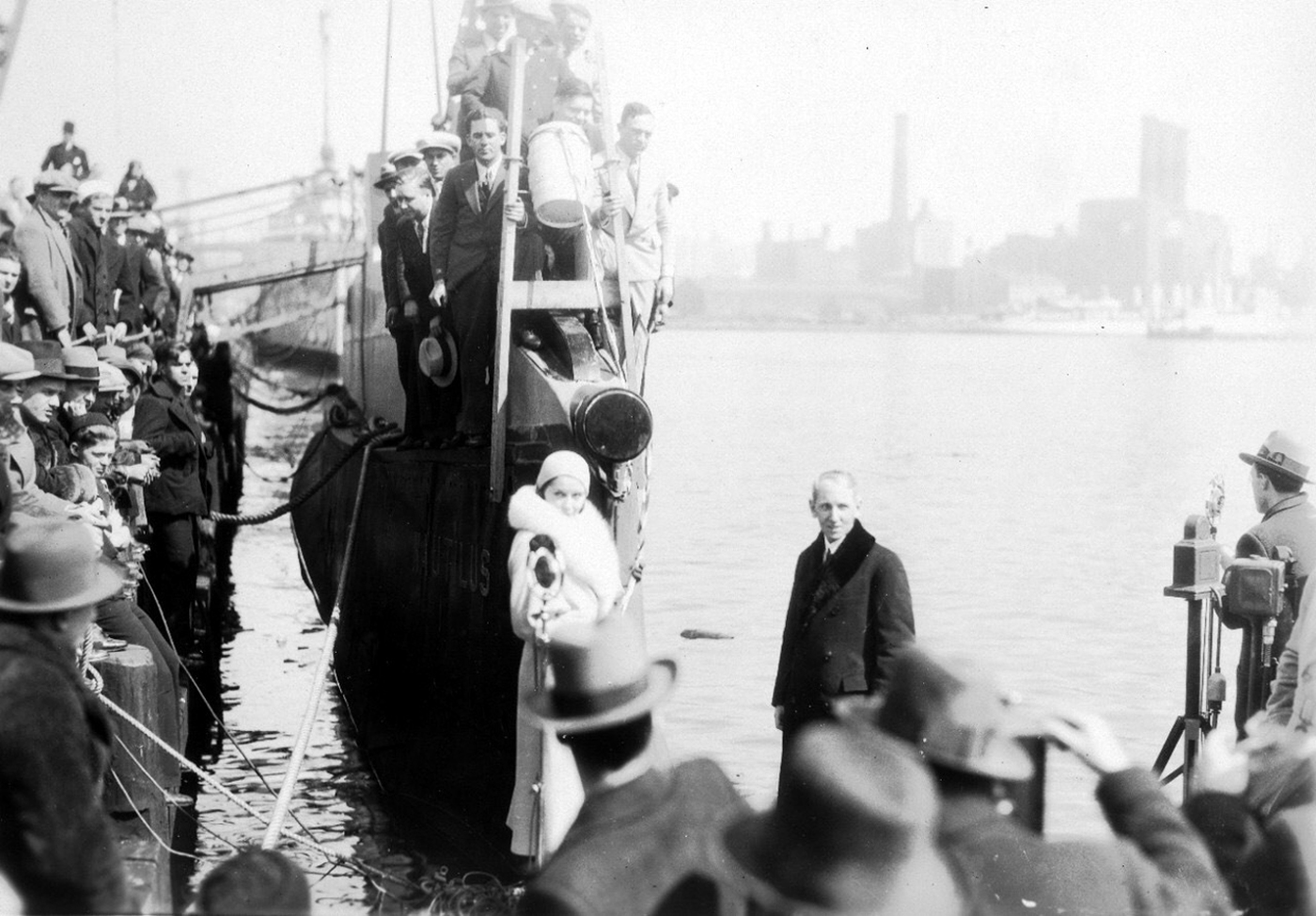 418k | 1 April: Tragedy marred the first trip of Sir Hubert Wilkins submarine Nautilus in which the explorer hopes to navigate beneath the Arctic ice, when Willard B. Grimmer, the twenty seven year old quartermaster of the submarine was swept overboard in New York harbour as the submarine made its way to the Brooklyn Navy yard for its christening. | Photo by George Rinhart/Corbis via Getty Images, courtesy of gettyimages.com. | |
