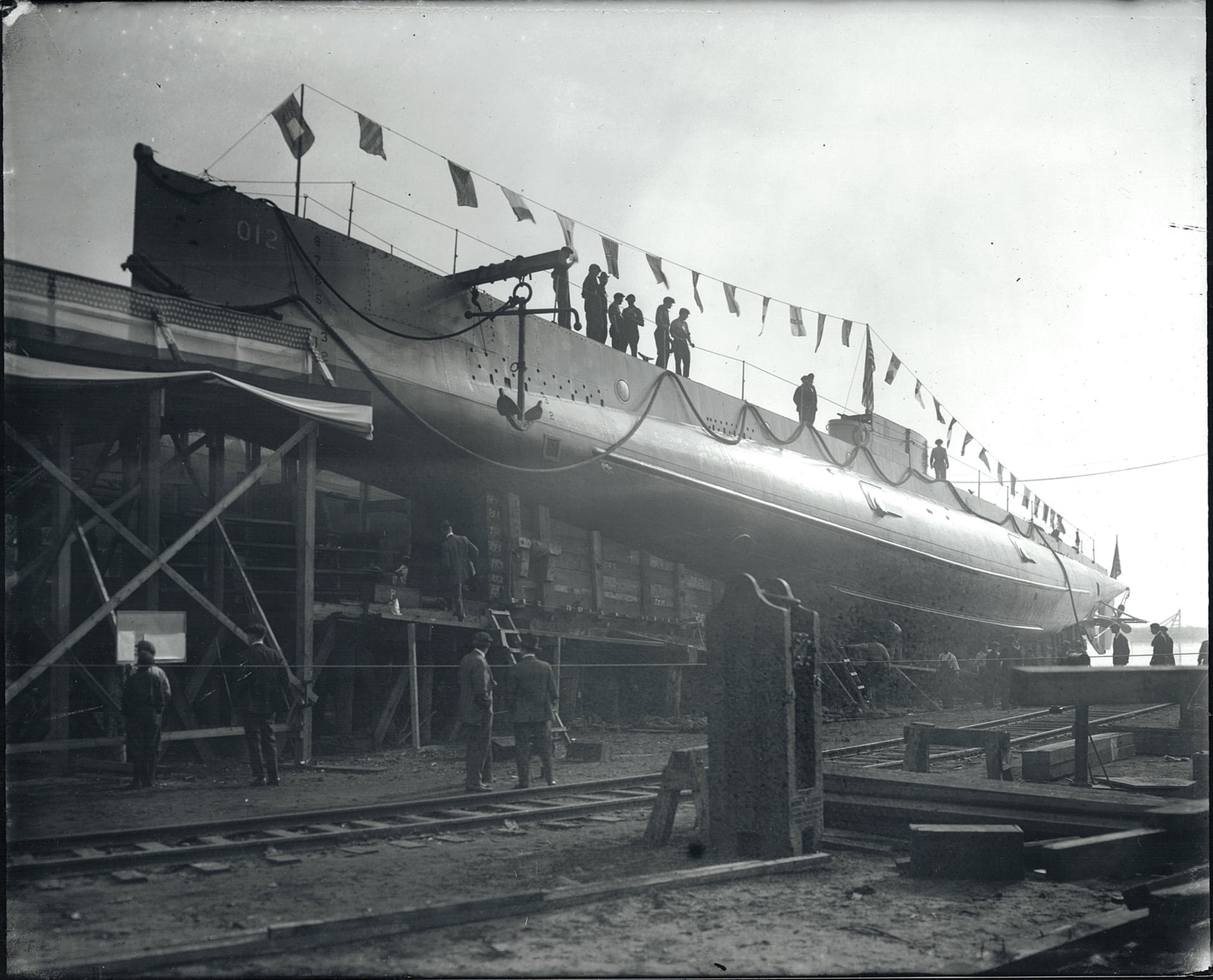 1.87k | O-12 (SS-73) about to slide down the ways at Lake Torpedo Boat Co., Bridgeport, CT. 29 September 1917. | USN photo courtesy of Wendy Gulley, Archivist Submarine Force Museum, NAVSUBASE NLON | |