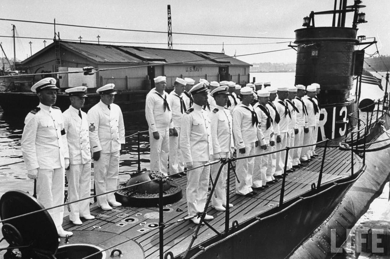 ![]() | 171k | Sailors standing aboard the R-13 (SS-90), 1939. | Photographer: Carl Mydans, courtesy of Life via Bill Gonyo. | |