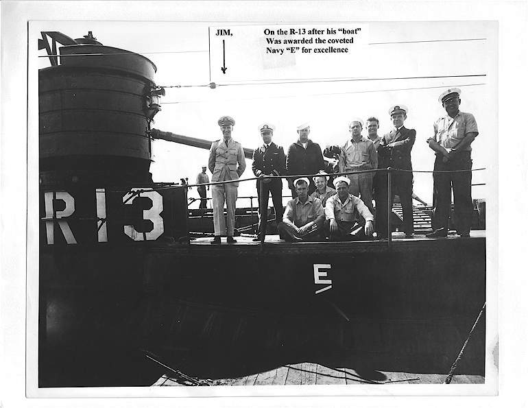 ![]() | 52k | February 1937 - Summer 1938 photo of the Commander of the R-13 (SS-90), Mannert L. Abele and members of the boat on deck after the R-13 received the Navy's coveted "E" for excellence. | USN photo courtesy of Bruce, Brad and John Abele, sons of Lieutenant Commander Mannert L. Abele, K.I.A., while commmanding the Grunion (SS-216), 30 July 1942. | |