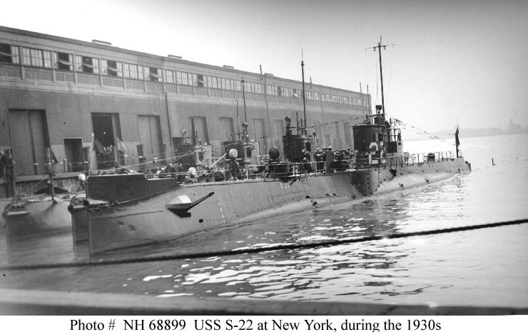200k | S-22 (SS-127), at New York City, circa the 1930s. Inboard submarines are (left-to-right): R-1 (SS-78); R-13 (SS-90) and R-4 (SS-81). | Text courtesy of # NH 68899. USN photo courtesy of Scott Koen & ussnewyork.com. |