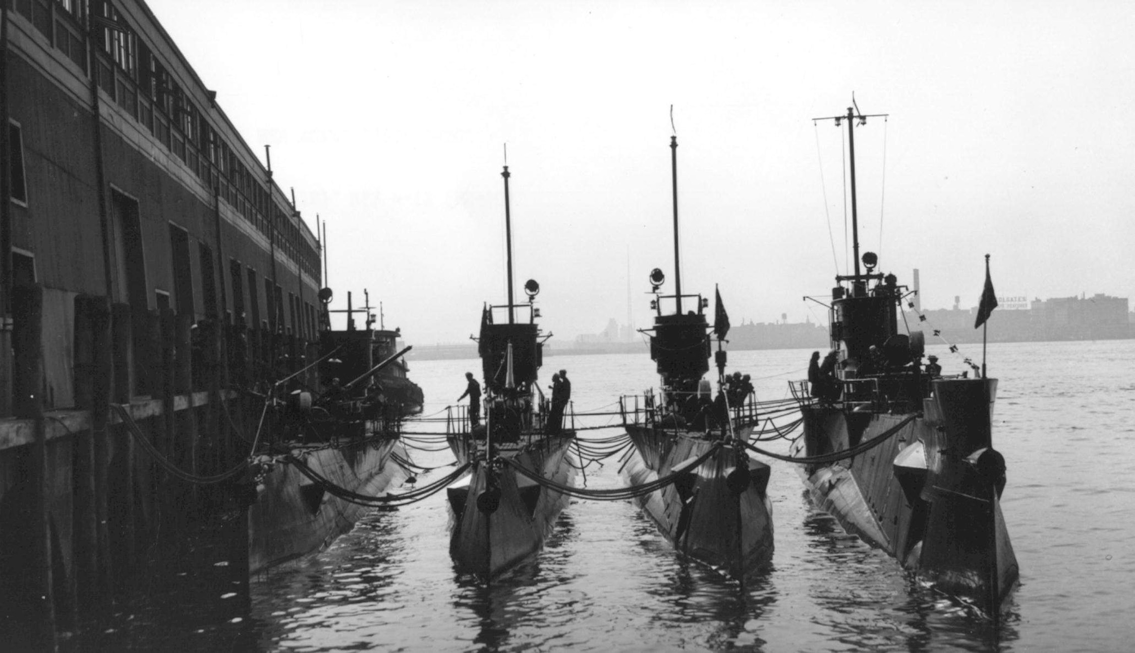 These "boats" are, from left-to-right: R-11 (SS-88), R-13 (SS-90), R-4 (SS-81) and S-22 (SS-127). | Text courtesy of # NH 68898. USN photo courtesy of Scott Koen & ussnewyork.com. |