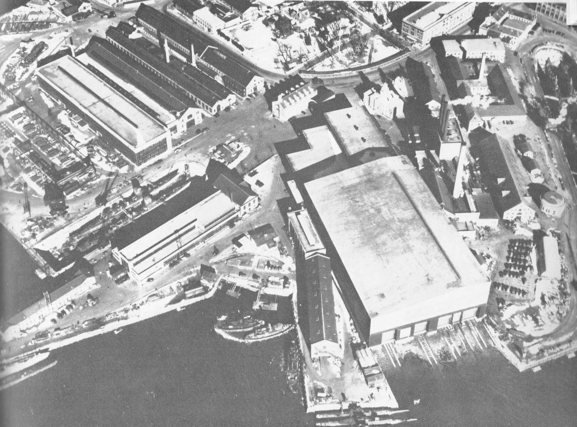 401k | This air view of Portsmouth Navy Yard taken just after the end of WW II shows the main shipbuilding shed which enabled construction to continue unimpeded by the Maine winters. The shed was widened to add two ways in 1941, and a fifth was squeezed in a year later. Drydocks No. 1 (left) & 2 (far right) contain six fleet submarines, while three R-boats are moored in the foreground. The Pompano (SS-491) would have been under construction in the first ways on the left hand corner of the main shipbuilding shed. |