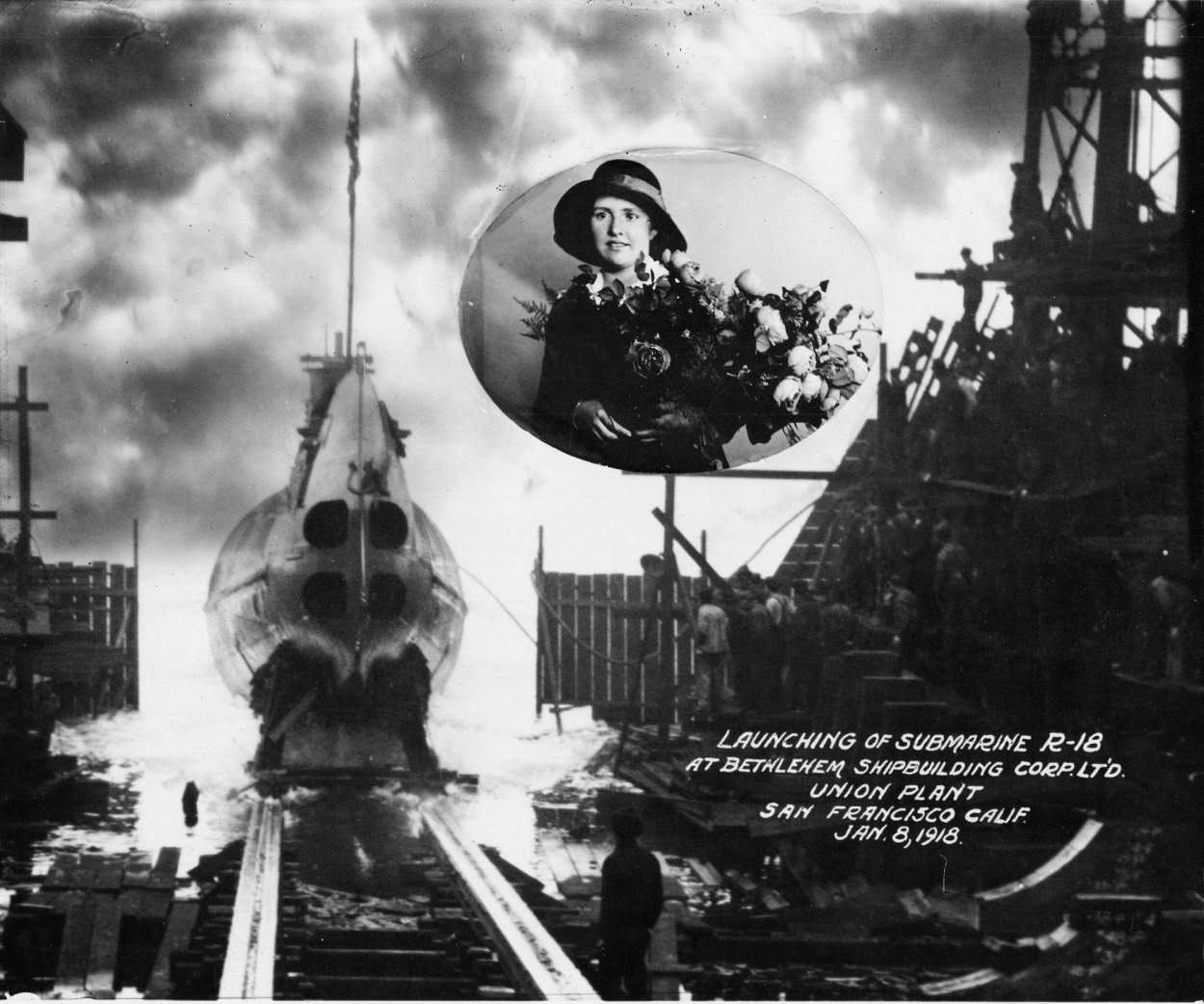 726k | Launching of R-18 (SS-95) at Bethlehem Shipbuilding Corp. Lt'd. Union Plant San Francisco, Calif. on 8 January 1918. Insert is a picture of the ship's sponsor, Miss. Marion S. Russell. | USN photo courtesy of Darryl L. Baker. | |