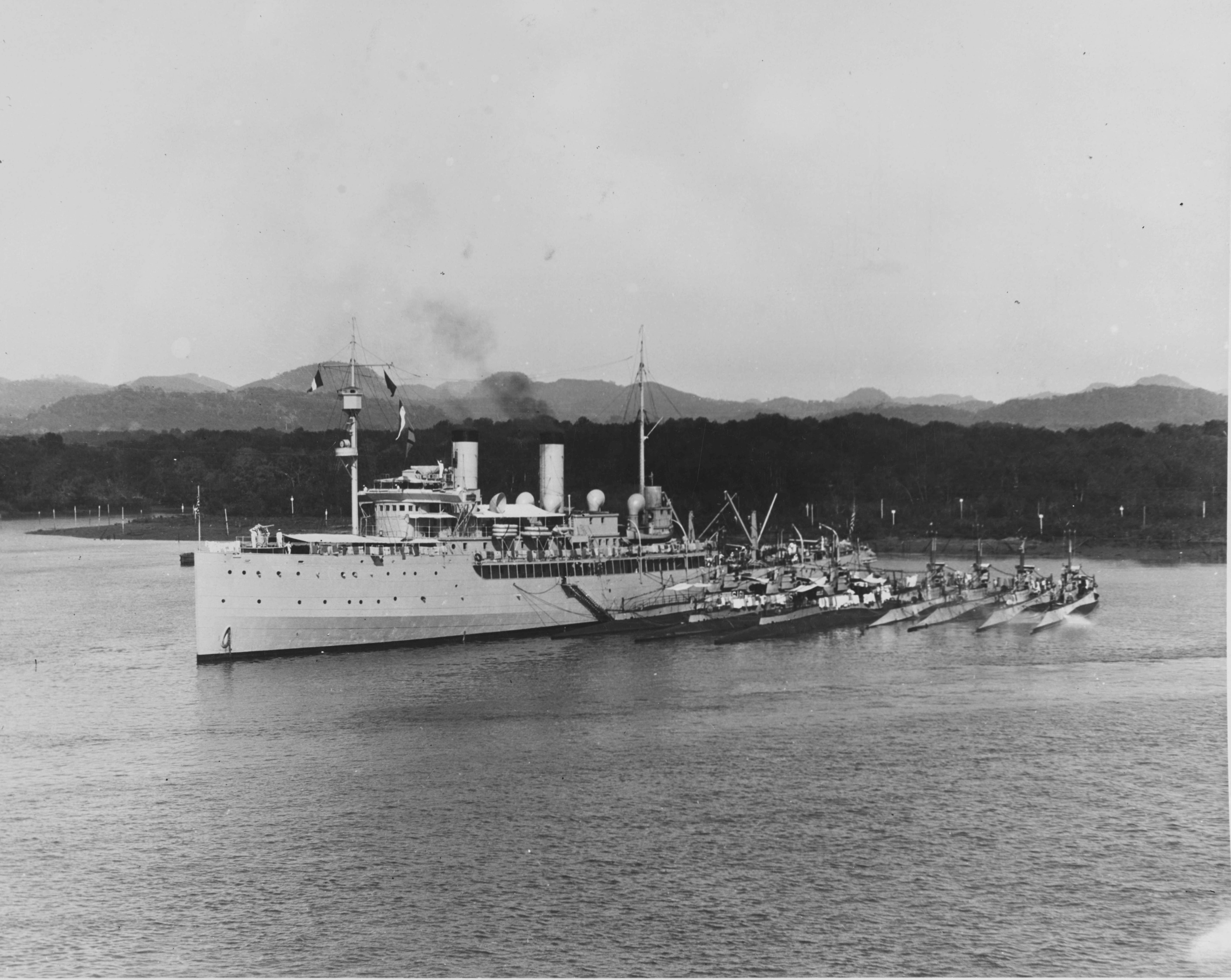 1.58k | Control Force submarines and their tenders at Cristobal, Panama Canal Zone, circa 1923. The tenders are (from left to right): Savannah (AS-8), Bushnell (AS-2), Beaver (AS-5) and Camden (AS-6). Submarines are mostly R-boats, among them R-23 (SS-100) and R-25 (SS-102), both in the nest alongside Savannah's port quarter. The larger submarine alongside Savannah's bow may be S-1 (SS-105), with her large seaplane hangar. |