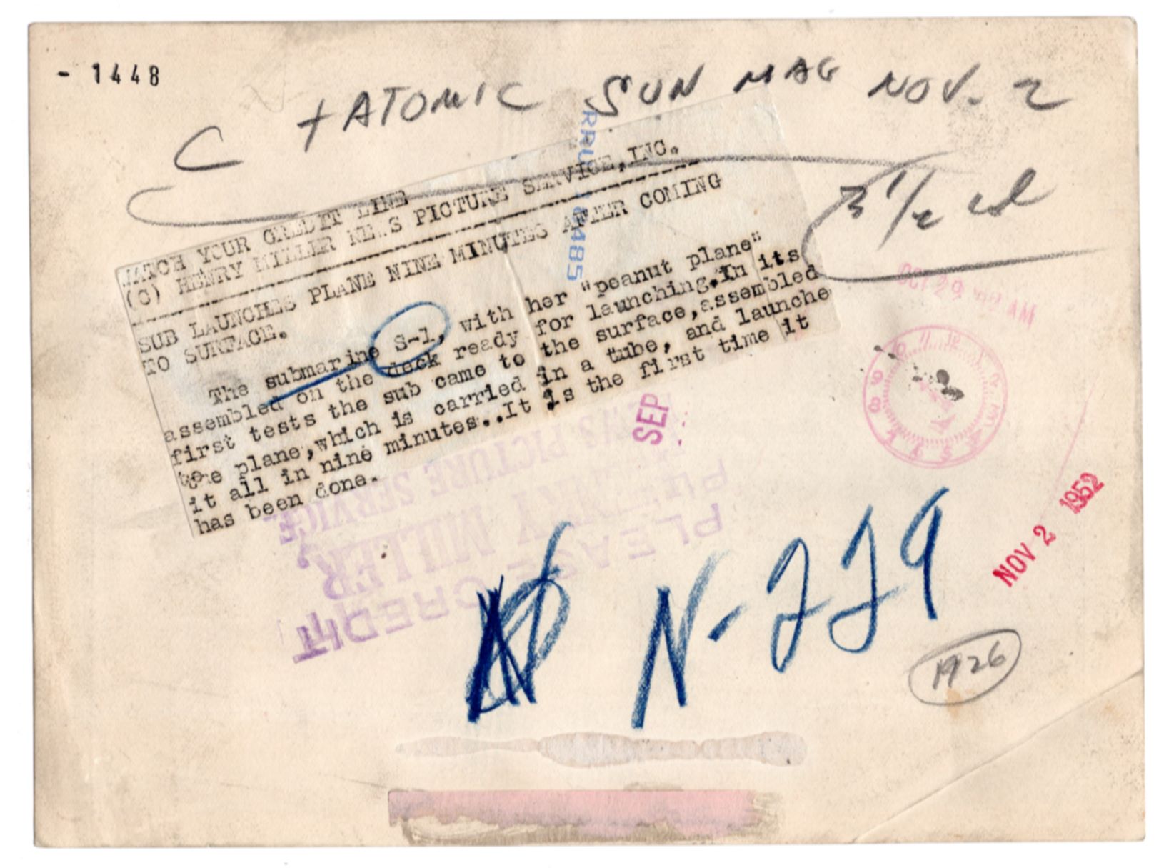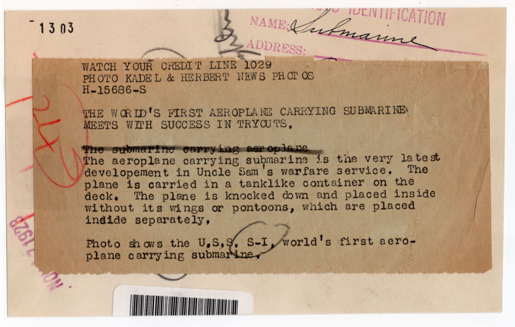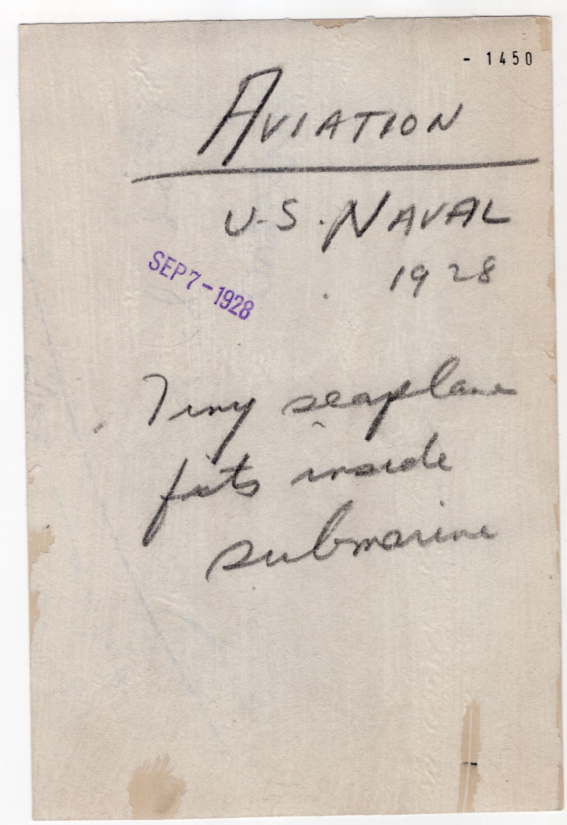 ![]() 0810516s | NR | Navy Cox-Klemin XS-2, Buno A 6519 on the deck of the S-1 (SS-105). Text of photo: The submarine S-1, with her peanut plane assembled on the deck ready for launching. In its first tests the sub came to the surface, assembled the plane, which is carried in a tube, and launched it all in 9-minutes. It is the first time it has been done. Photo caption text, partial date stamped of the month is September. and hand written year 1926. The November 1952 is probably when the photo was reused in a news article. The S-1 continued these experiments until 1926. | Partial text via US Navy and Marine Corps Museum/Naval Aviation Museum, Photo No.2011.003.185.004, courtesy of Mike Green. Photo & text courtesy of nky-photos.com via James Bass |