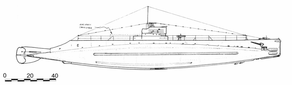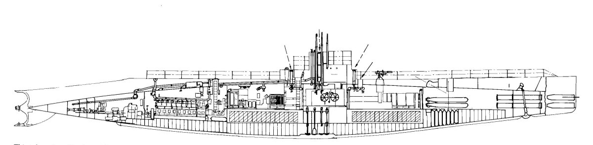 62k | This inboard profile shows E.B.'s S-1 (SS-105) as designed; it was designed from the boat's contracts plans, dated February 1917. Note the gun access hatch (arrowed) forward of the conning tower. When a big 4-in/50 gun replaced the small 3-in/23 shown, the access hatch had to be abondoned in favor of a smaller ammunition-passing scuttle. Dashed arrows indicate the usual three ventilators grouped around the conning tower fairwater. Batteries are shaded for clarity. | Drawing & text courtesy of U.S. Submarines Through 1945, An Illustrated Design History by Norman Friedman. Naval Institute Press. | |