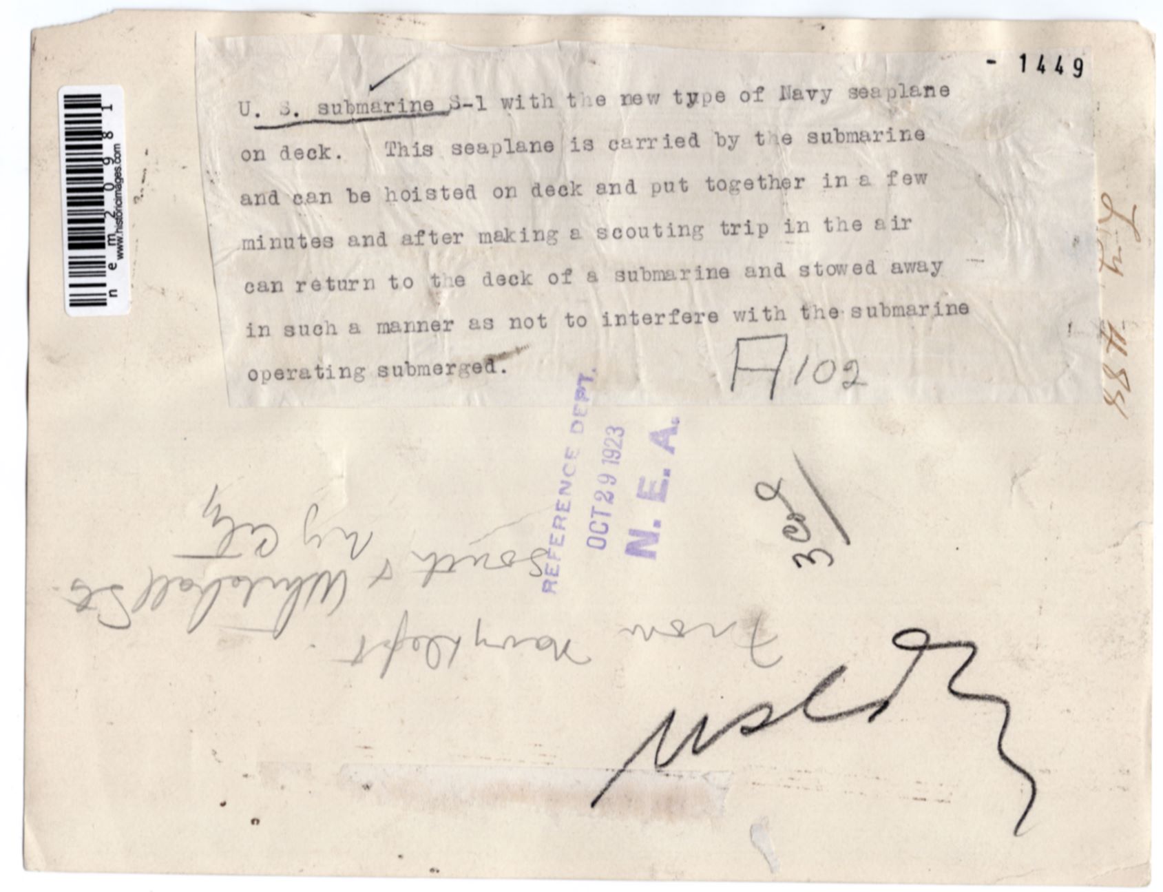 ![]() 0810510 | 1.13k | Text of photo: The submarine US submarine S-1 (SS-105) with the new type of Navy seaplane on deck. This seaplane is carried by the submarine and can be hoisted on deck and put together in a few minutes and after making a scouting trip in the air can return to the deck of a submarine and stowed away in such a manner as to interfere with the submarine operating submerged. Date stamped 29 October 1923. Note I am not sure whether this is the XS-1 or XS-2. | Photo & text courtesy of nky-photos.com via James Bass | |