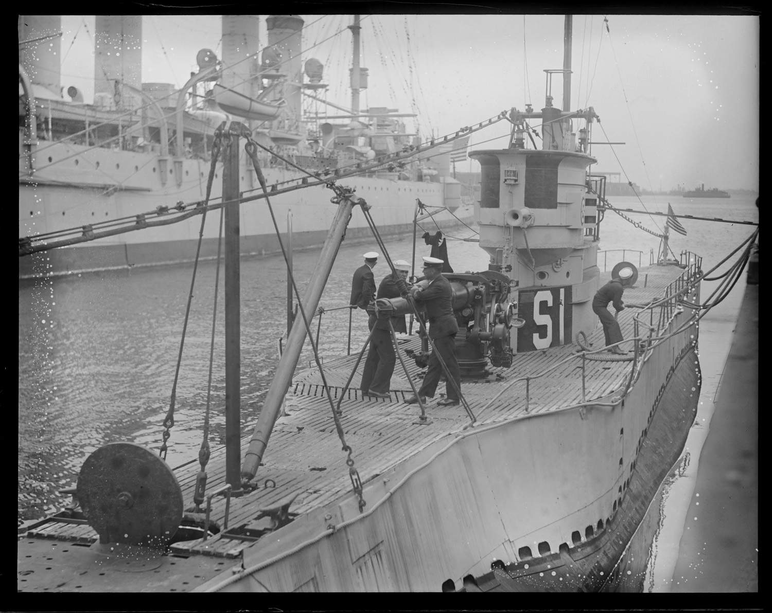 168k | Officer and crewman on deck of S-1 (SS-105) converse over gun, at Boston Navy Yard, circa 1930. | Photo courtesy of the Boston Public Library, Leslie Jones Collection via Sean Hert & flickr.com. | |
