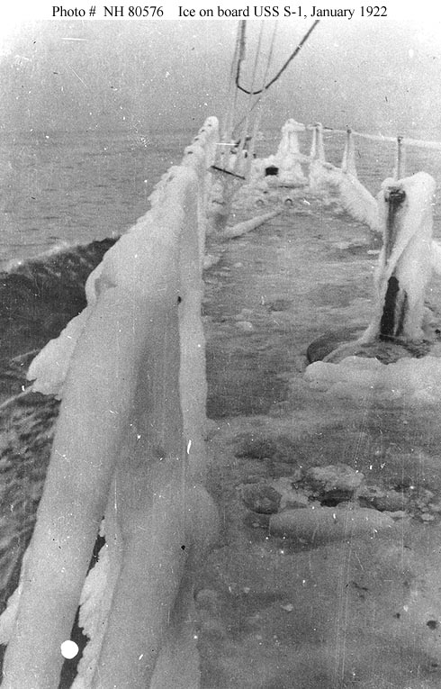 95k | S-1 (SS-105) covered with ice while underway in Long Island Sound, January 1922. Note the retractable 3"/23 deck gun at right. | Courtesy of the Naval Historical Foundation. Collection of Lieutenant O.E. Wightman. USNHC photograph # NH 99776. | |